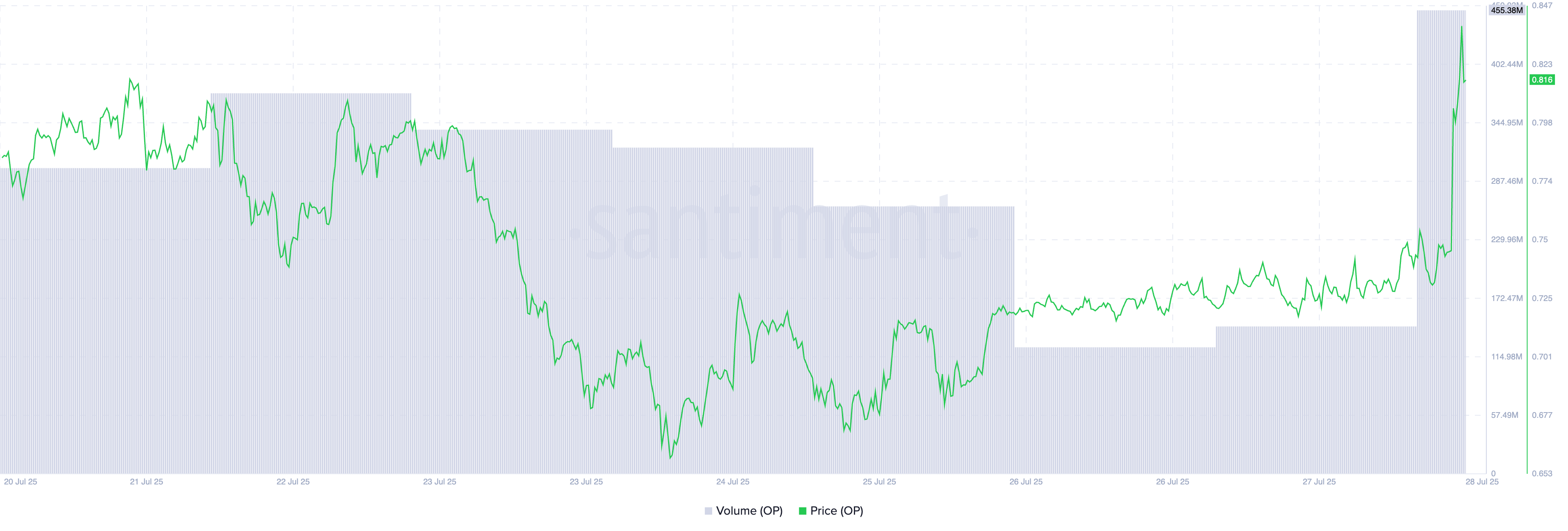 OP 的积极价格走势、交易量的攀升以及净流量数据表明,如果市场动能持续,该代币可能在短期内继续上涨。在这种情况下,代币价格可能突破 0.84 美元的阻力位,达到 0.95 美元。