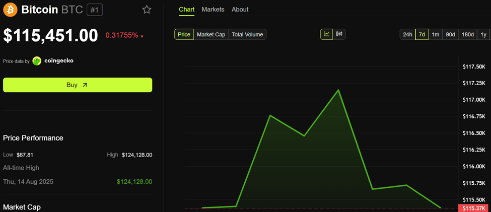 截至撰写本文时,比特币的交易价格为 115,451 美元,过去 24 小时内下跌了 0.31%。