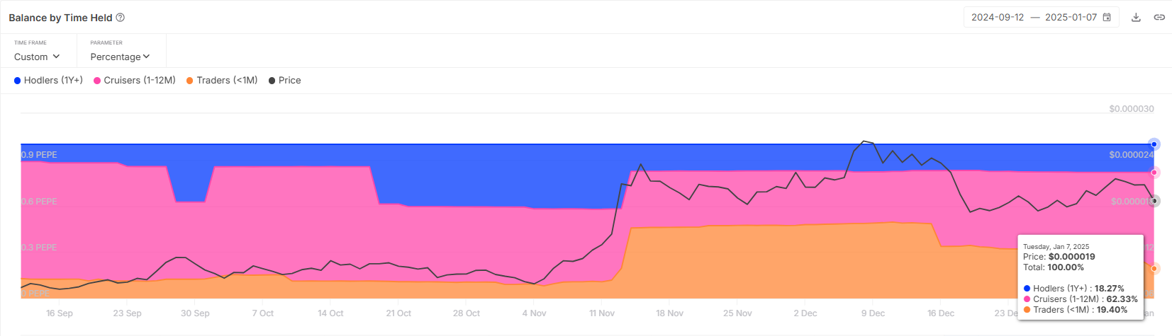 PEPE 的短期持有者(STH)表現出顯著的韌性,選擇轉為中期持有者(MTH),而非在下跌期間賣出。在過去兩週內,STH 的集中度從 48% 降至 19%,大幅下降了 27%。這一變化顯示出許多投資者對迷因幣的長期前景持樂觀態度,選擇持有而非退出其持倉。