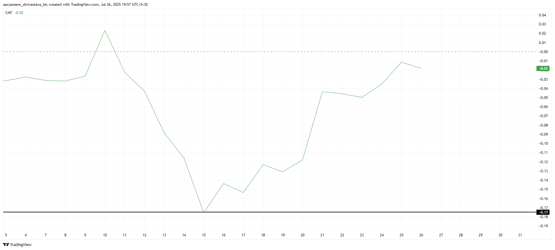 Pi 币的宏观动能也显示出改善的迹象,Chaikin 资金流量指标(CMF)显示出明显的上升趋势,表明流入该山寨币的资金增加。