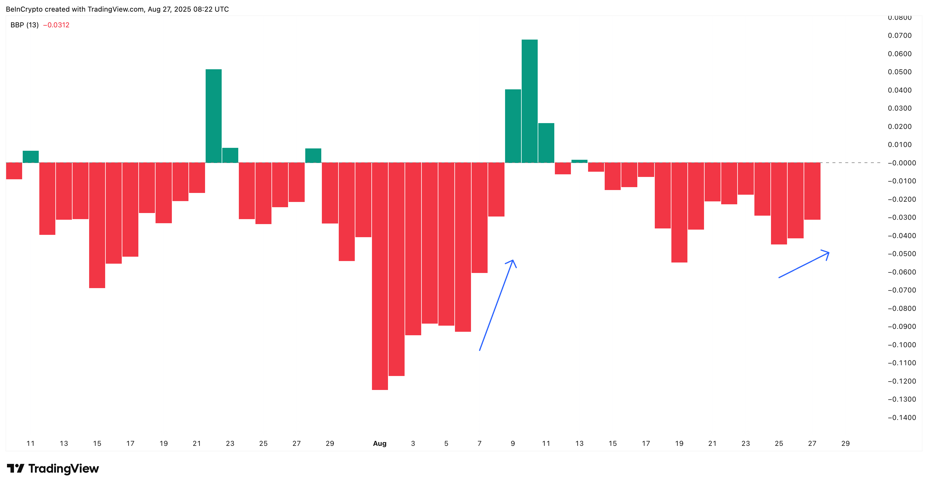 本月早些时候,在 RSI 背离阶段出现的类似看跌力量下降,随后出现了一次短暂但迅速的反弹,价格达到 $0.46。MFI 和牛熊力量共同加强了 RSI 背离的信号,指向市场正在转向积累阶段。