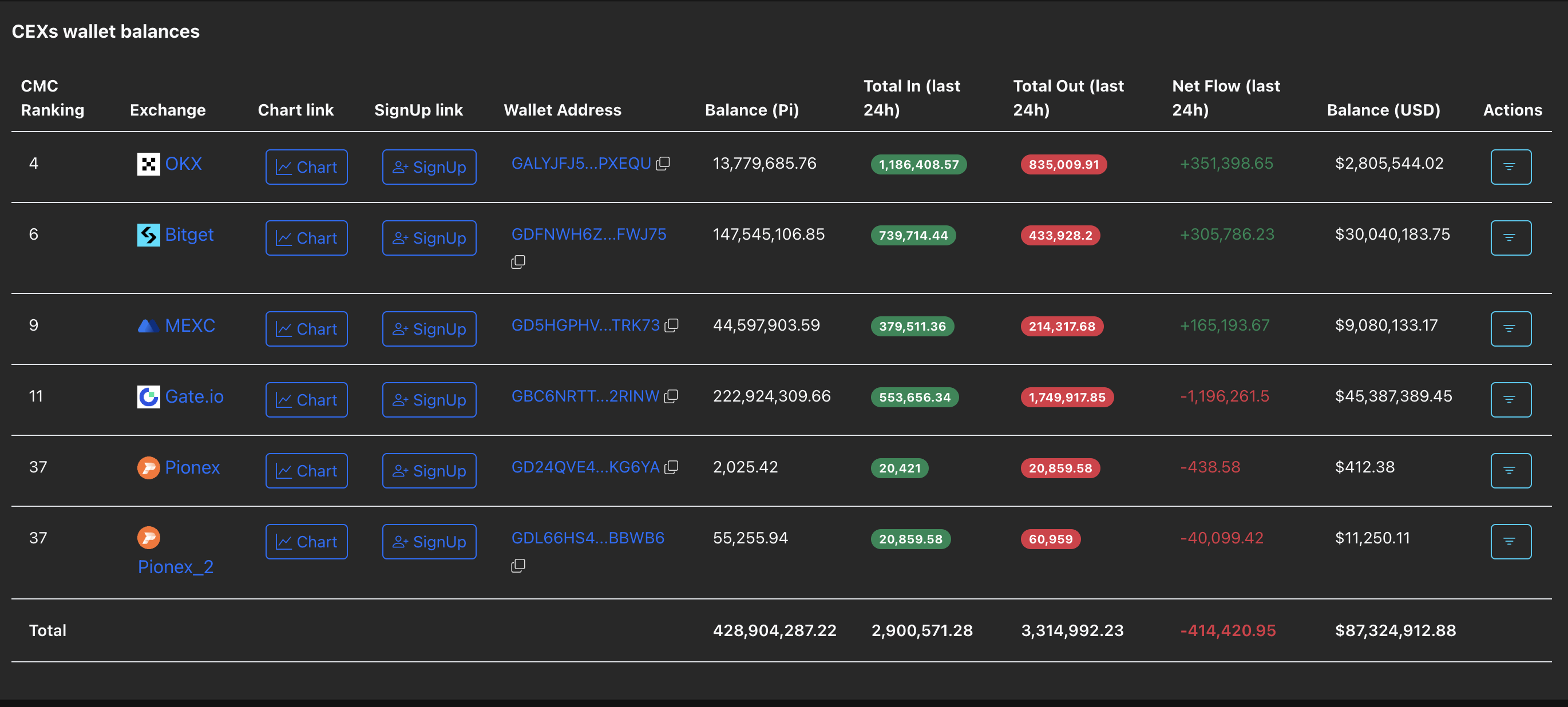 在主流中心化交易所,Pi 币录得约 414,420 PI 净流出,意味着流出交易所的代币多于流入。这通常反映市场倾向买入而非抛售。