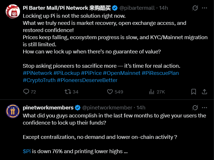 许多指出,在没有明确的实用性或流动性的情况下,现在锁定更多的 Pi 币显得过早,甚至具有剥削性。