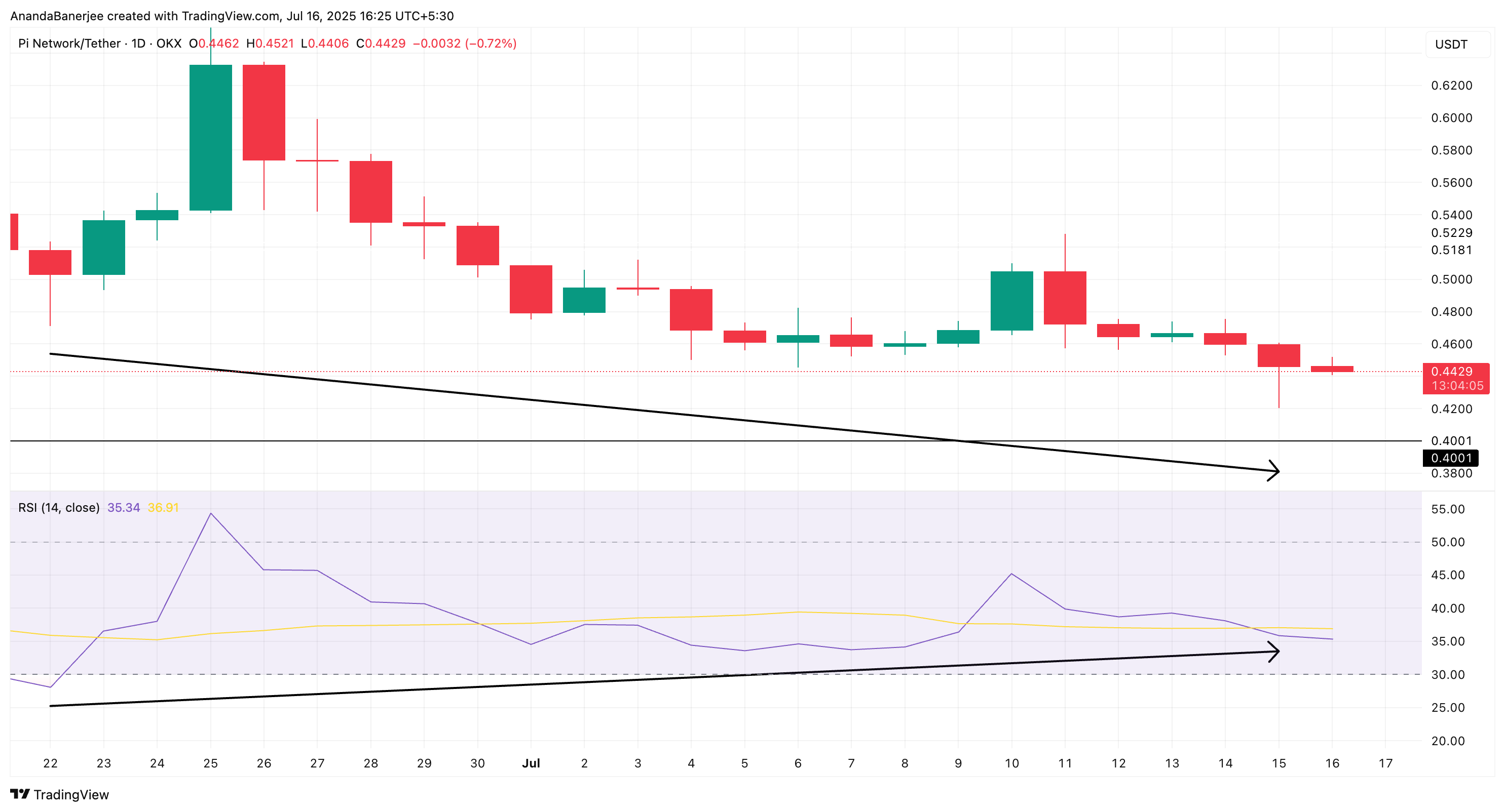 PI 的价格在 6 月底至 7 月 15 日期间创下更低的低点,但作为动量追踪器的 RSI 却形成了更高的低点。这种不匹配通常表明,尽管价格看似疲软,但买入压力正在悄然积聚。