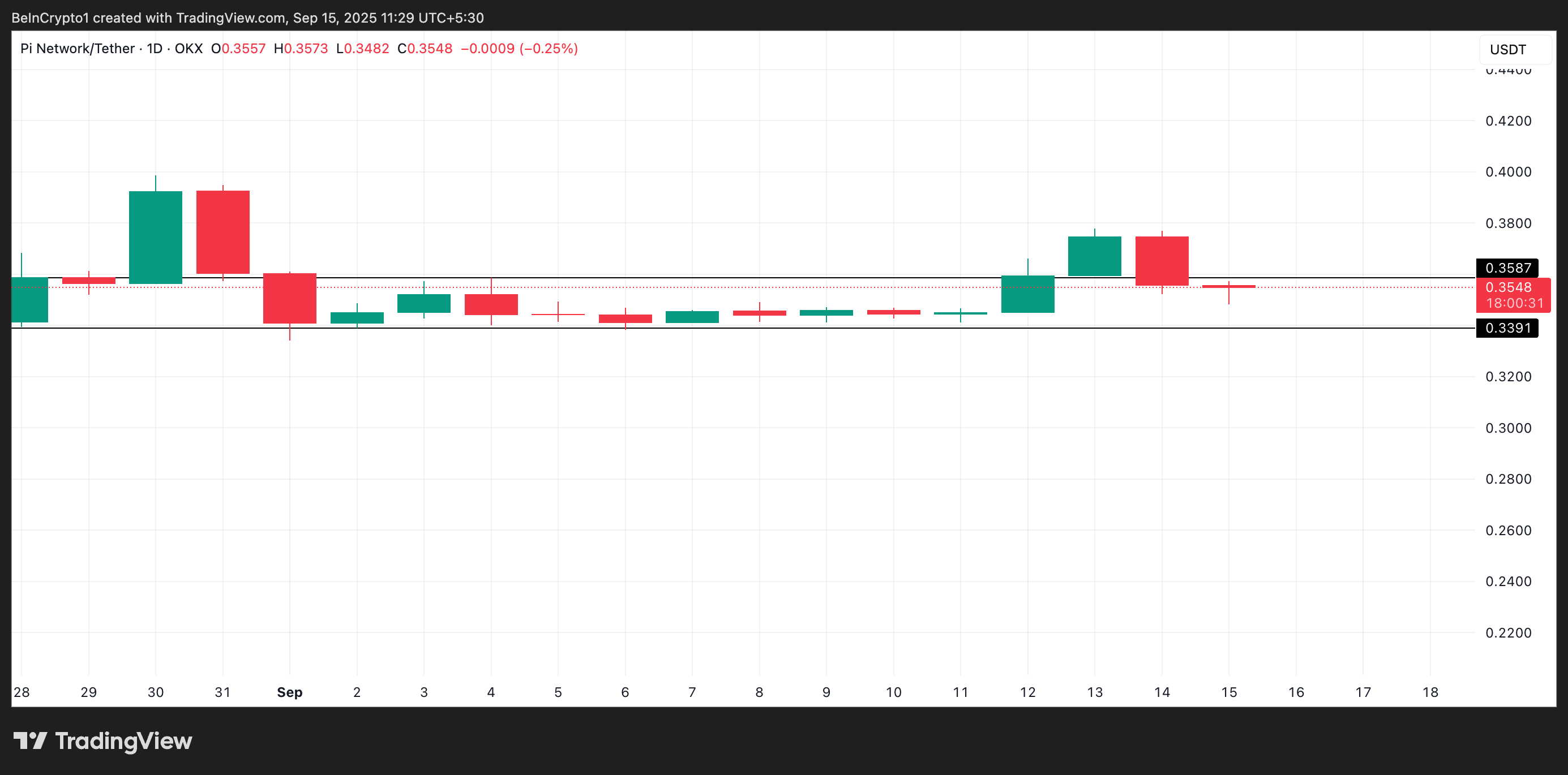 持续的卖压可能会使 PI 陷入 $0.3587 的阻力位和 $0.3391 的支撑位之间的盘整区间。如果看跌情绪加剧,该山寨币可能会测试并跌破这一支撑位,成功突破后可能会使 PI 回到其历史低点 $0.3220。