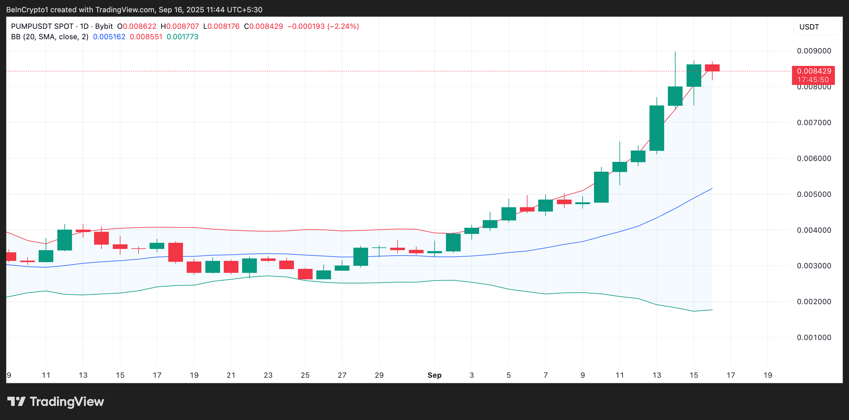 当某资产的价格持续向上轨移动时,可能意味着其处于超买区域。截至撰写本文时,PUMP 的交易价格接近这一线,表明该代币远高于其平均交易区间。