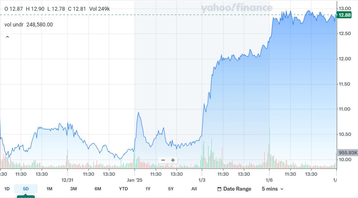 該公司股價在公告後上漲近5%,交易價格為12.88美元。