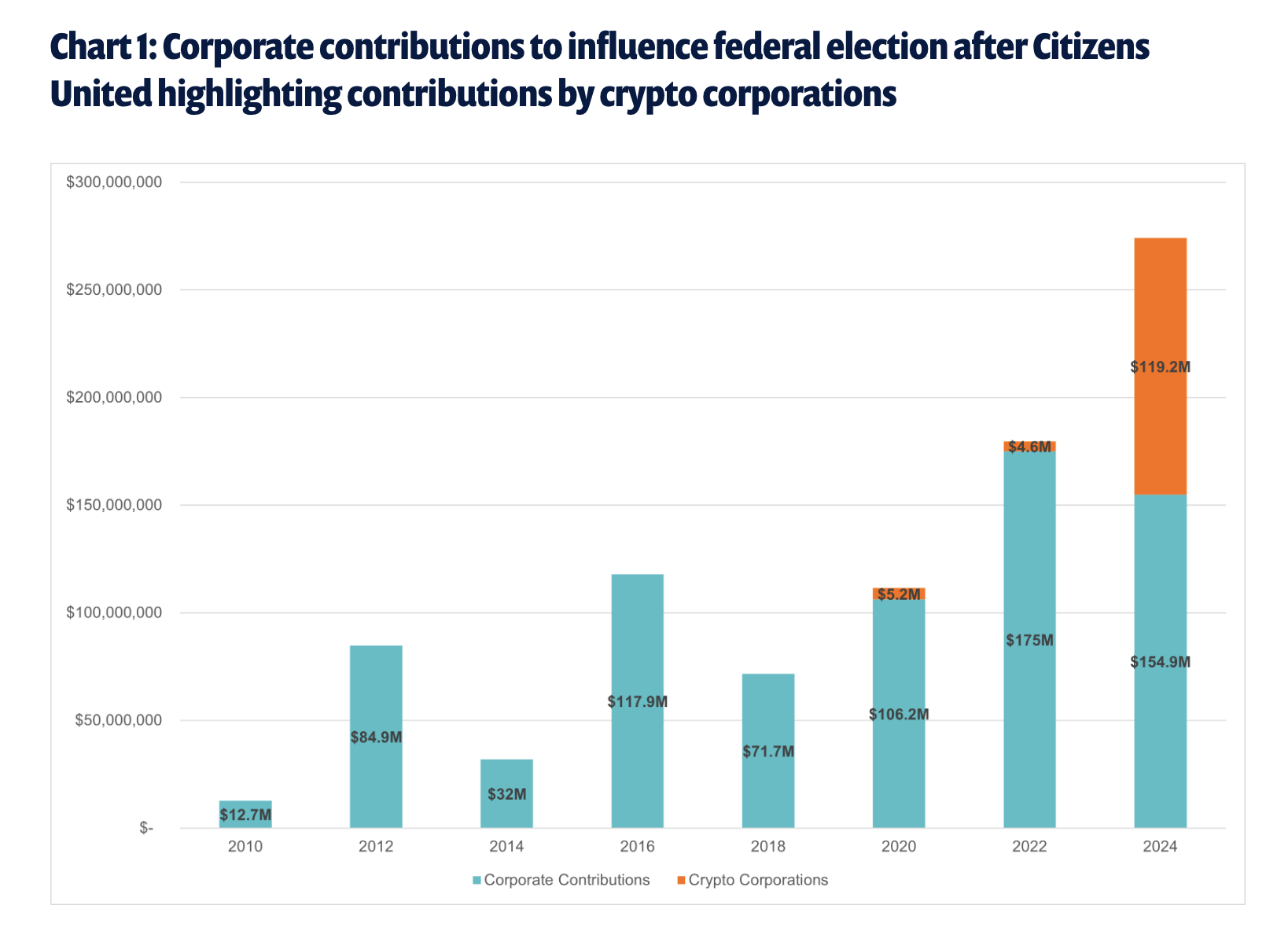 根據公共公民組織的報告,超過1.19億美元來自加密貨幣公司,用於影響2024年聯邦選舉,主要通過支持親加密貨幣候選人並反對懷疑者的非黨派超級政治行動委員會 Fairshake 進行。