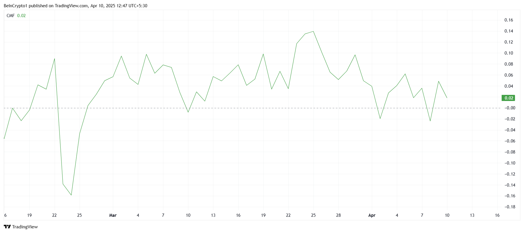 這表明,儘管淨流入為正,但與積極發展的規模相比仍顯得不足。如果 RSR 的價格在未來幾天繼續上漲,CMF 有可能開始反映出更強的正面情緒。