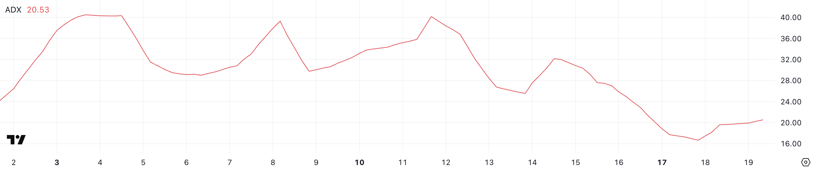 ADX 值有助於確定趨勢是強還是弱,通常使用 25 作為門檻——高於此水平的讀數表示強勁趨勢,而低於此水平則表明動能較弱或整合。