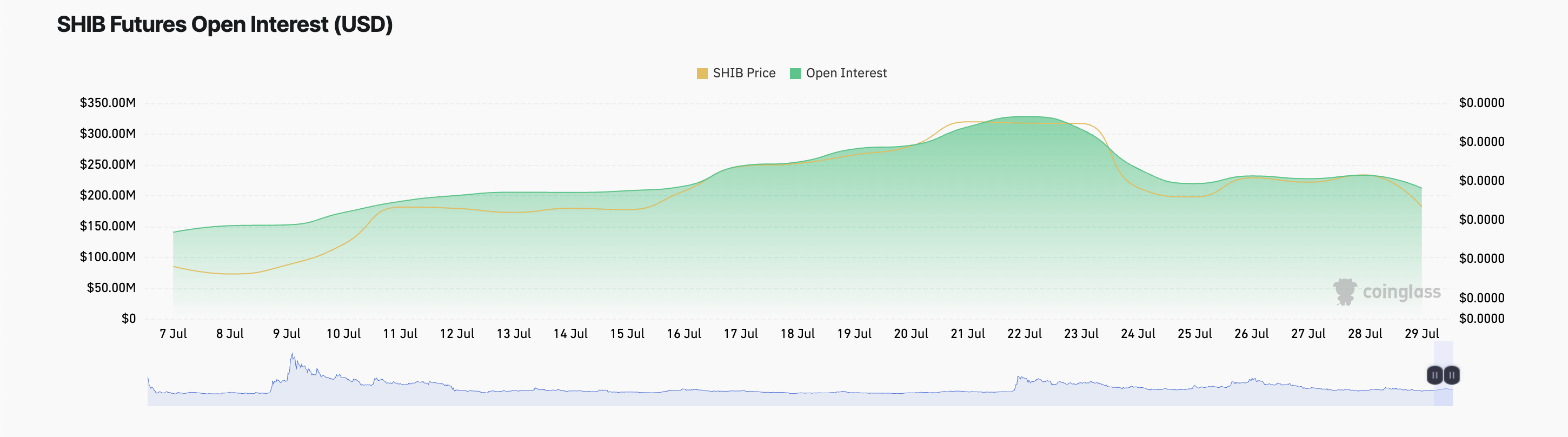衍生品市场的情绪反映了链上所见的疲软。自 7 月 22 日以来,SHIB 的期货合约未平仓合约量持续下降,截至撰写本文时已下跌 35%,降至 2.1248 亿美元。