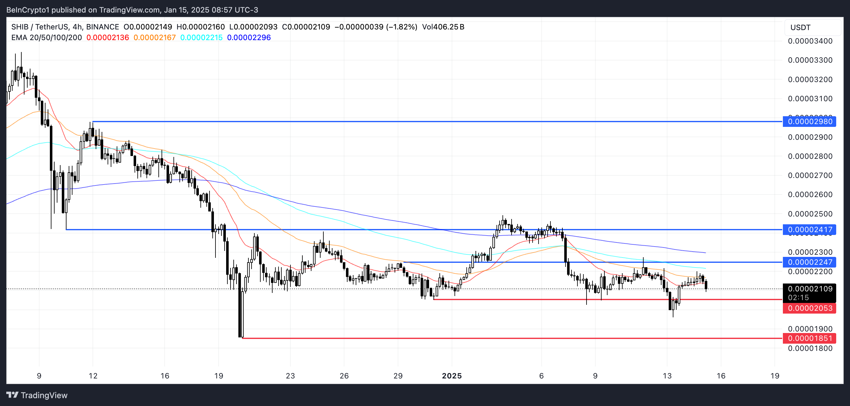 相反地,若出現上升趨勢,SHIB 價格可能測試 0.000022 美元的阻力,若突破,將向 0.000024 美元移動。