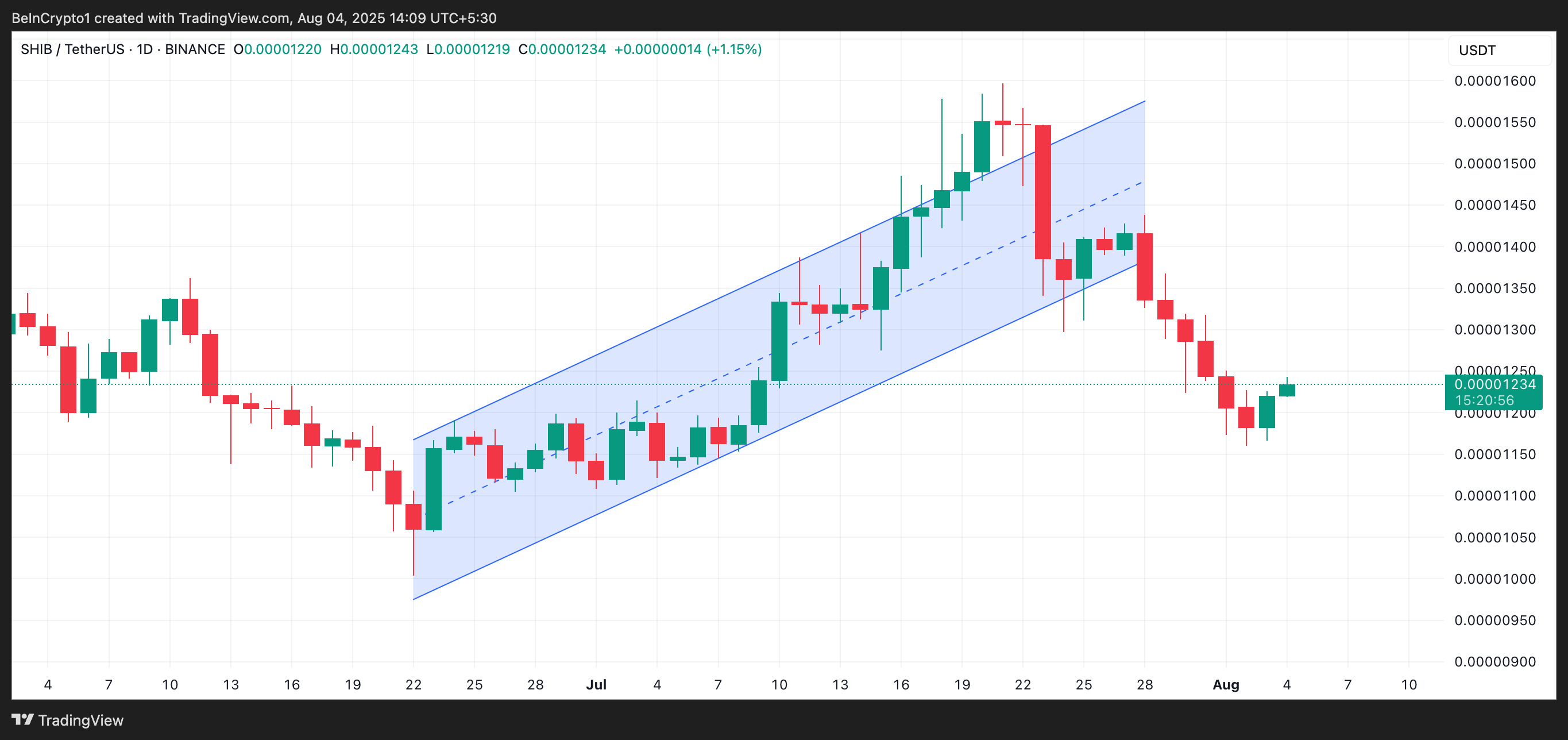 从 SHIB/USD 的日线图来看,自 7 月 28 日跌破上升平行通道以来,柴犬币一直在稳步下滑。这一突破表明多头力量的减弱,并暗示市场的卖压已经占据上风。