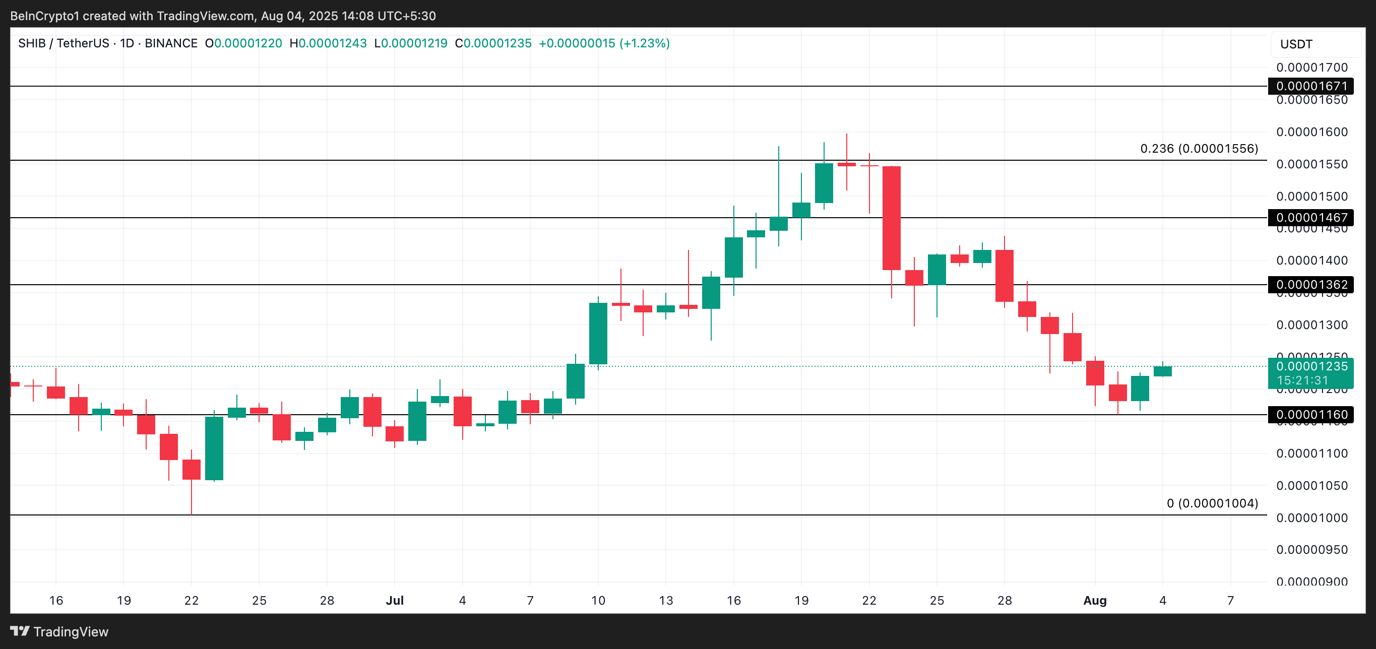 截至发稿时,$SHIB 的交易价格为 0.00001235 美元。如果鲸鱼继续增持,而散户持有者保持信心,这枚迷因币可能在短期内反弹至 0.00001362 美元的阻力位。