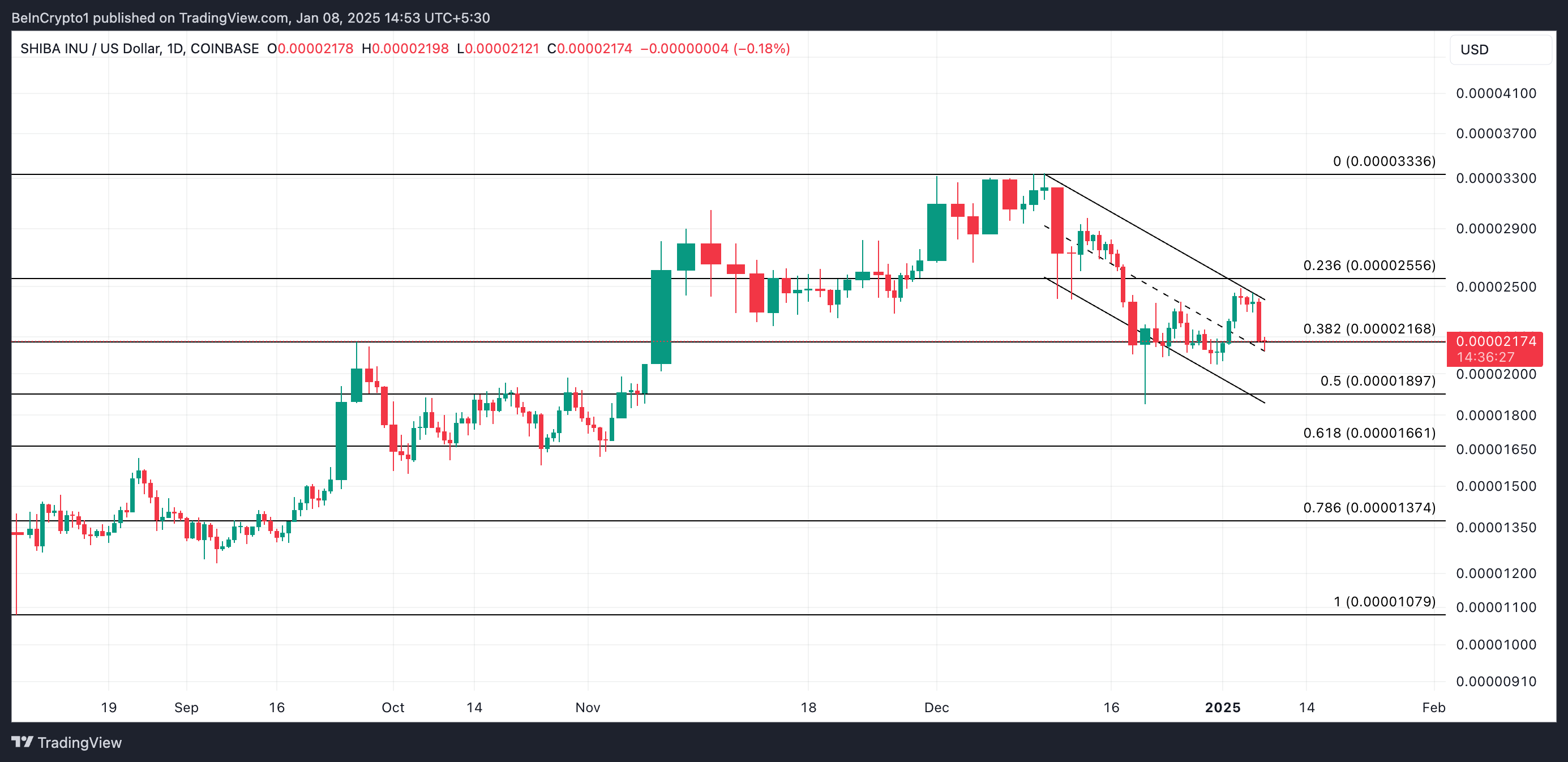 在日線圖上,SHIB 在過去 30 天內於下降平行通道內交易——這是一種由兩條向下傾斜的平行趨勢線形成的看跌模式,顯示出持續的低點和低高點。這表明持續的賣壓。如果 SHIB 保持在此模式中,其價格可能會跌至 0.000018 美元。