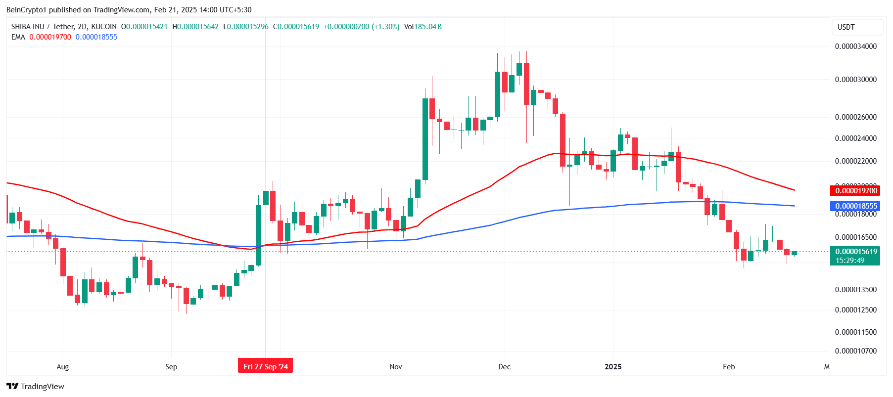 Shiba Inu 的價格目前為 0.00001559 美元,正處於突破自 2024 年 12 月以來的下降趨勢的邊緣。這次潛在的突破取決於保持當前價格水平並突破關鍵阻力區。成功突破 0.00001676 美元將引發價格上漲至 0.00001961 美元。