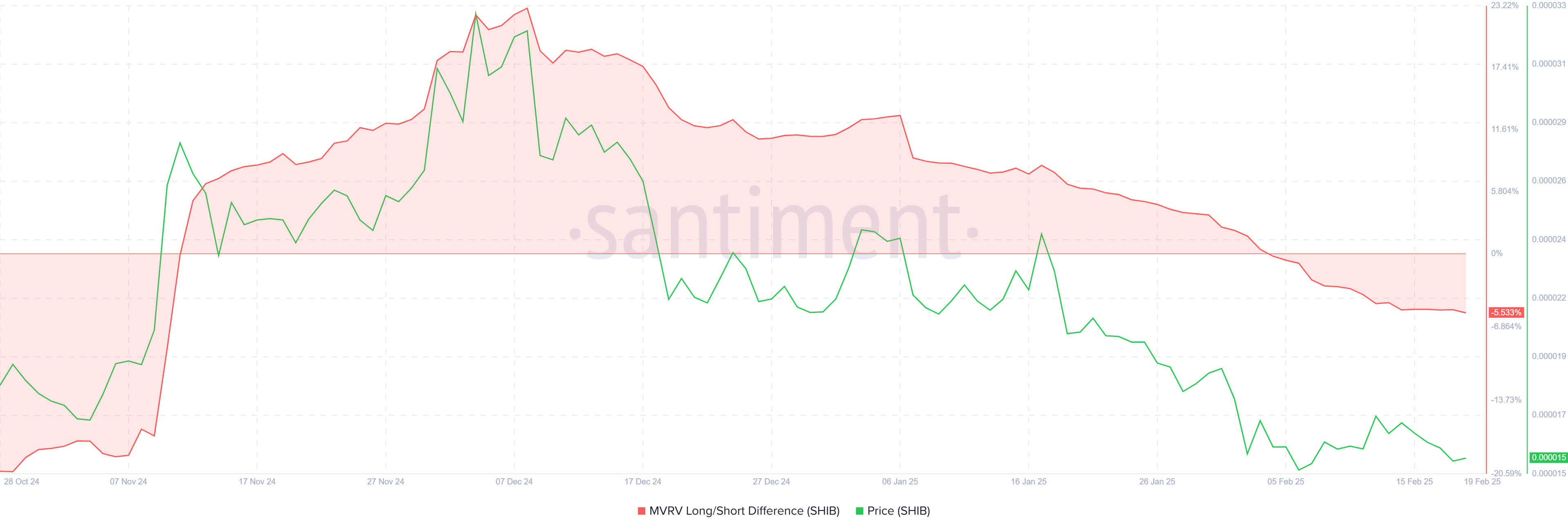 MVRV 長短期差異指標目前為 -5.5%,顯示長期持有者 (LTHs) 和短期持有者 (STHs) 在盈利方面陷入僵局。兩者目前都未獲得顯著收益,這對 Shiba Inu 是一個令人擔憂的信號。LTHs 和 STHs 缺乏利潤顯示投資者情緒可能保持低迷,進一步阻礙該山寨幣的價格復甦。