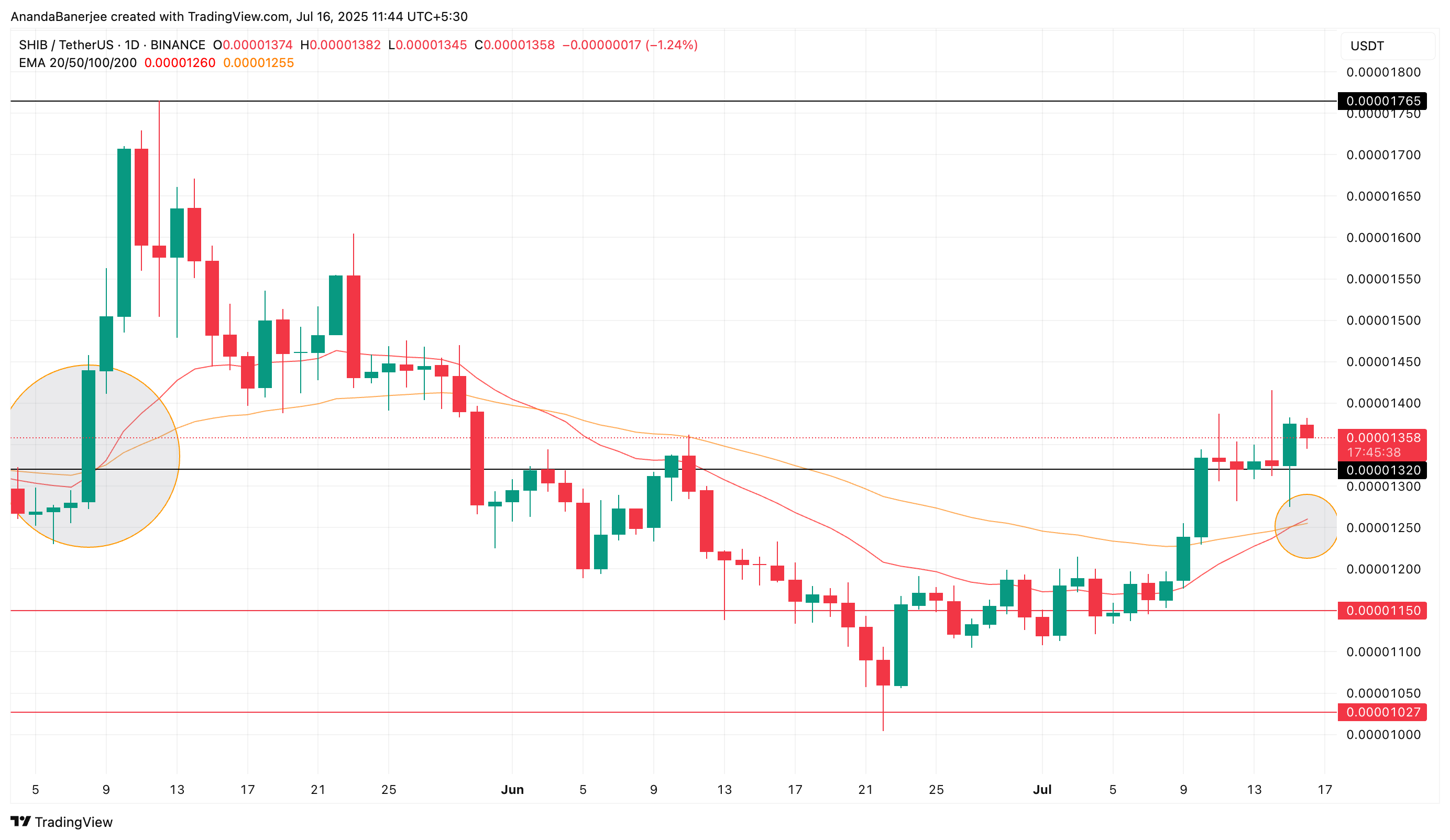 这一模式在 2025 年 5 月曾出现,当时价格约为 $0.00001320。彼时,$SHIB 上涨近 34%,达到 $0.00001765 的高点。有趣的是,当前的交叉出现在几乎相同的水平;$0.00001358,这增加了历史重演的可能性。