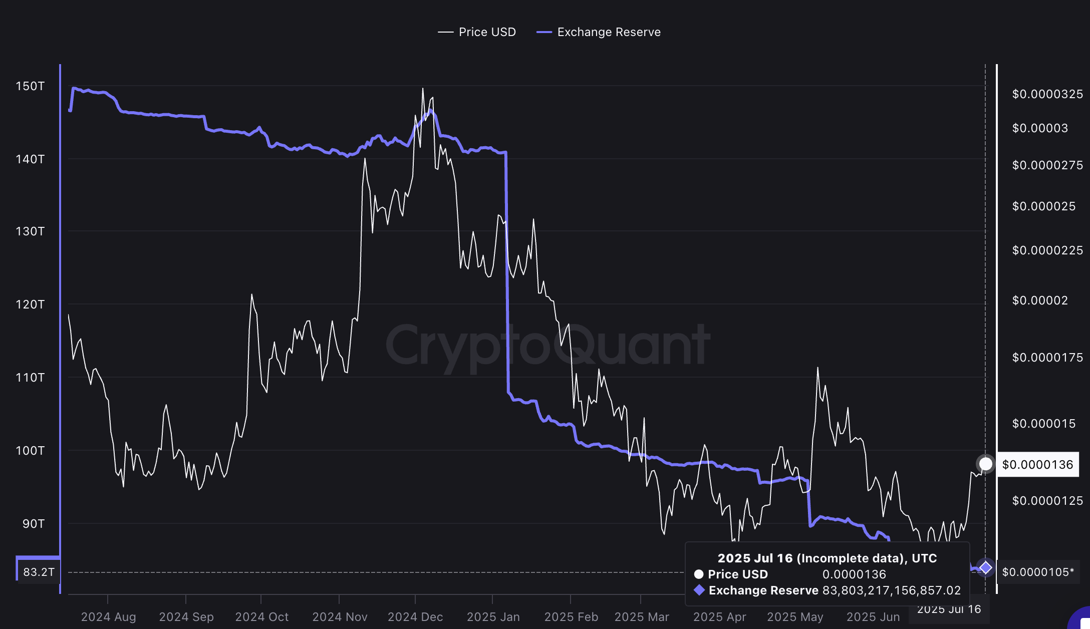 根据 CryptoQuant 的数据,柴犬币的链上交易所储备已降至 83,803,217,156,857 枚,为一年多来的最低点。基于当前 $SHIB 价格 $0.00001358,交易所持有的 $SHIB 代币总价值(83.8 万亿枚)约为 11.4 亿美元。