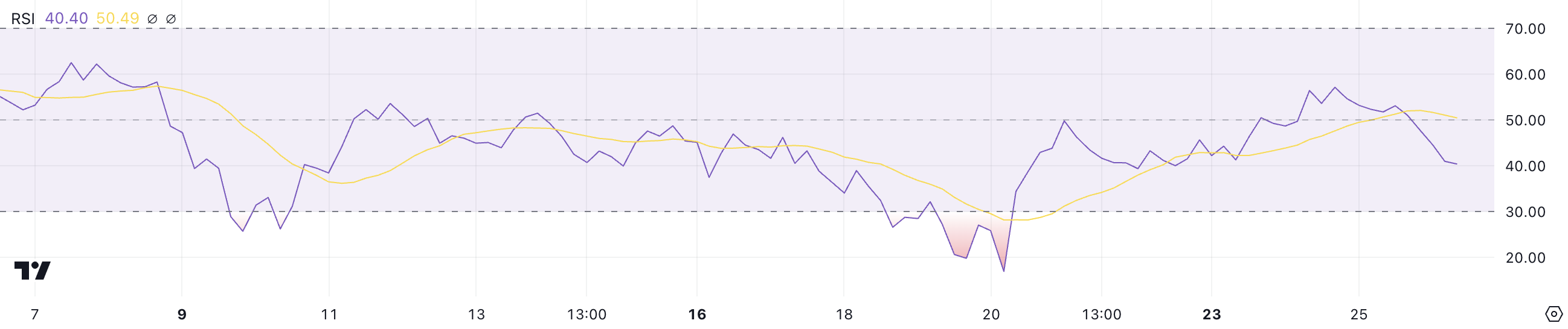 正方向指標 (D+) 已從兩天前的 23 降至 16.6,顯示出買入動能減弱,而負方向指標 (D-) 則從 18.6 上升至 23.7,反映出賣壓增加。這一組合表明賣方目前主導市場,買入興趣持續減弱。