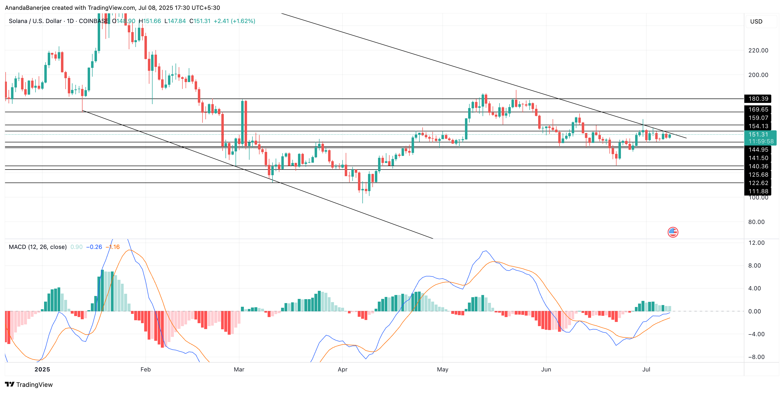 Solana 当前交易价格接近 151 美元。除非它能明确突破 155 美元,否则下降楔形仍将主导市场。