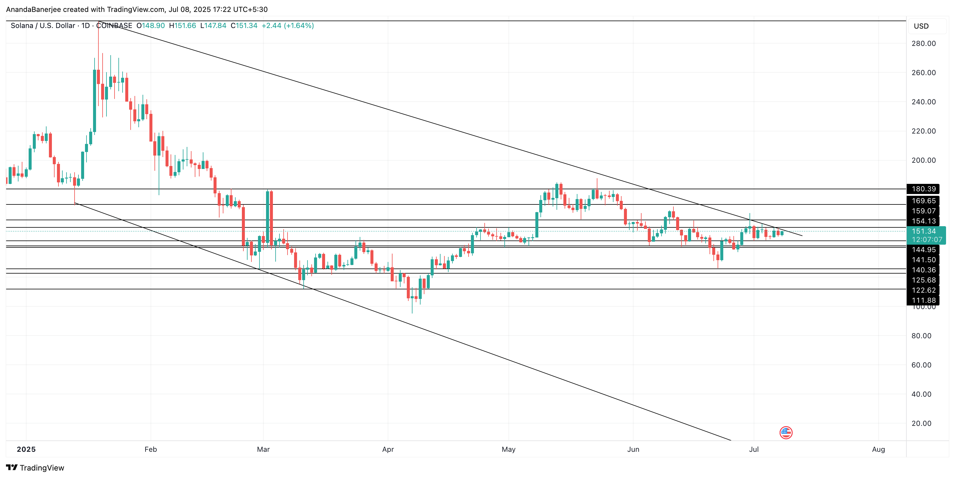 Solana 价格自 2025 年 1 月初以来一直处于一个宽幅下降楔形中。该结构仍然完好,但 SOL 多次测试上方趋势线而未能突破。该趋势线目前位于 155 美元下方,价格一直徘徊在附近但未能突破。