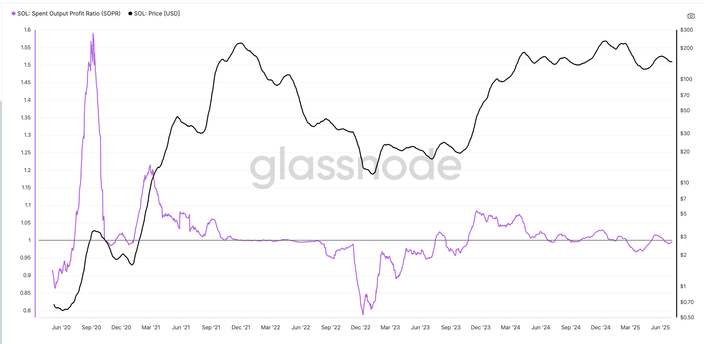 Solana 的已花费产出利润率(SOPR)自 6 月底以来一直徘徊在 1.0 以下。这通常意味着持有者在亏损或持平的情况下出售,常见于市场底部。