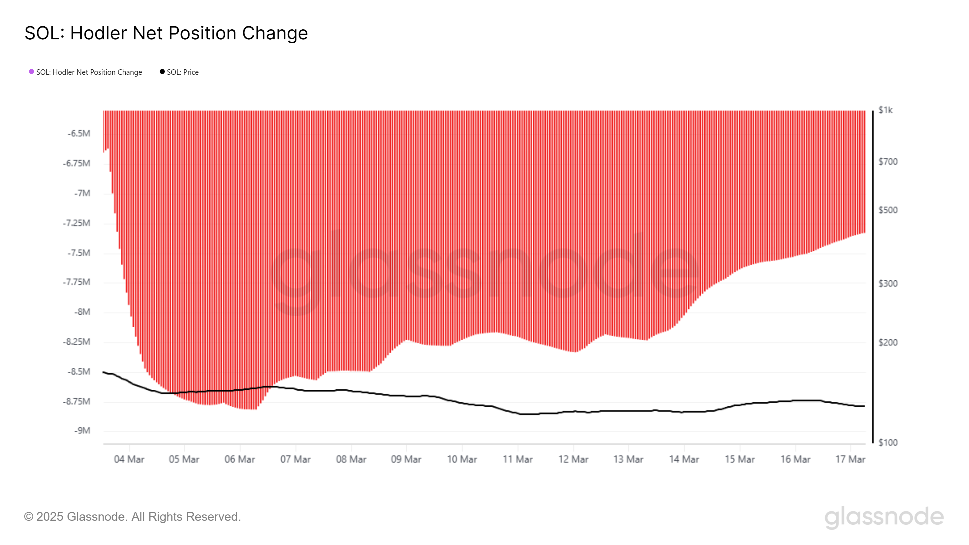 HODLer 淨持倉變化指標顯示,Solana 持有者正在回購他們先前賣出的 SOL。僅過去一週,長期持有者就累積了超過 100 萬枚 SOL,價值約 1.28 億美元。這種買入行為表明投資者對 Solana 價格回升的信心。