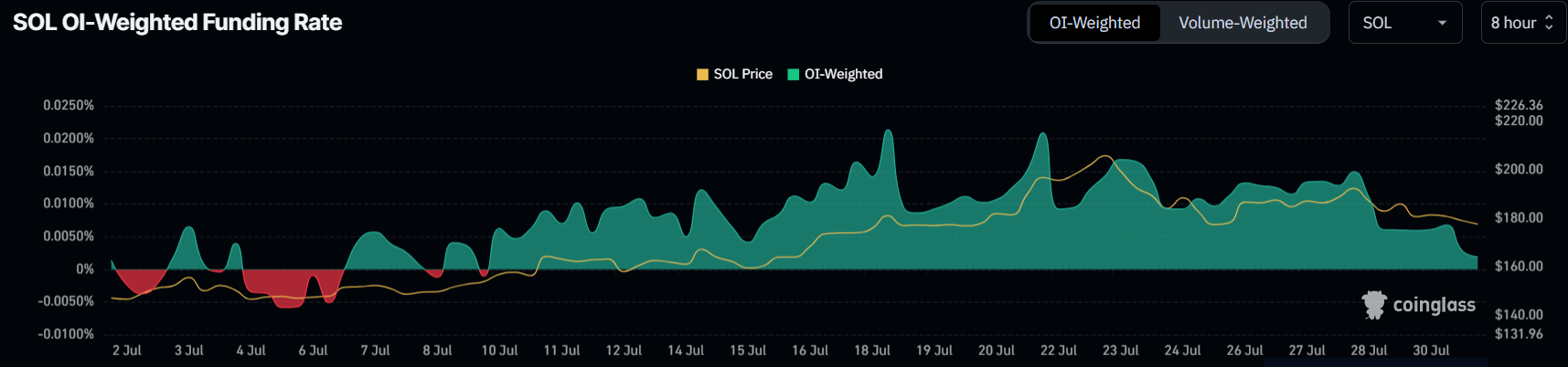 整个 7 月,Solana 的资金费率一直保持正值,显示出交易者对该加密货币潜力的信心。然而,资金费率目前接近转为负值的临界点。如果发生这种情况,将反映出交易者的乐观情绪正在减弱。