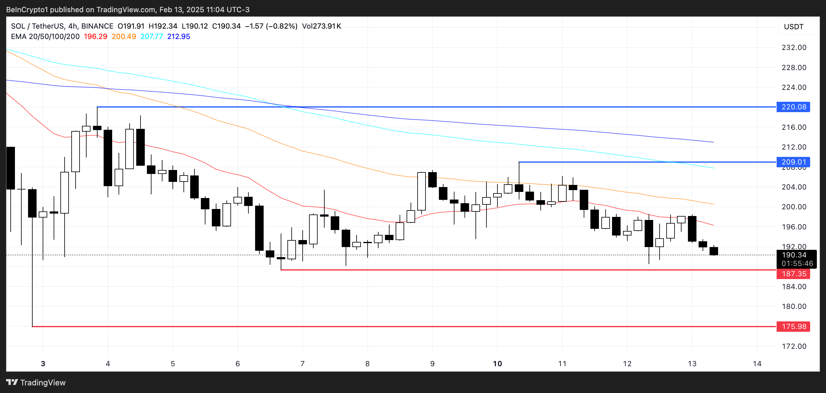 如果這種看跌趨勢持續,SOL 可能會測試 187 美元的支撐位,這是一個買家可能介入的關鍵水平。失去這個支撐可能會導致價格繼續下跌至 175 美元,加強下跌趨勢。然而,如果 SOL 能夠守住 187 美元並穩定下來,可能會出現反彈。