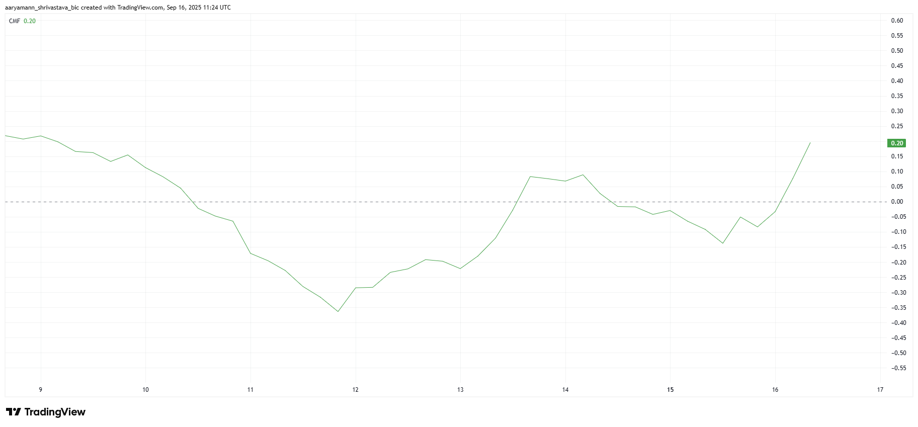 Chaikin 资金流量指标(CMF)反映出投资者对 Somnia 的乐观情绪正在增长。该指标衡量资金流入和流出情况,近期持续上升,表明流入该资产的资金多于流出的资金。