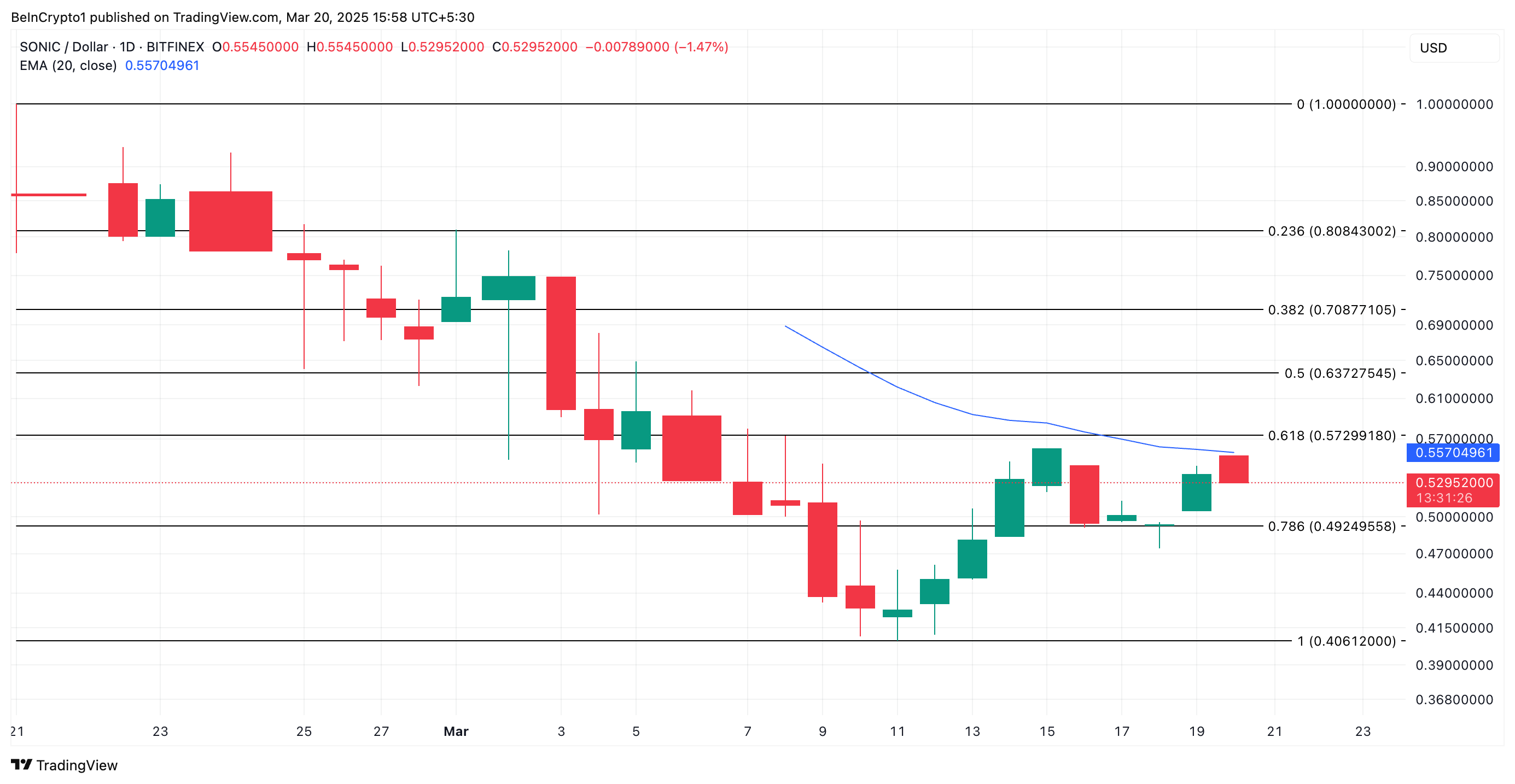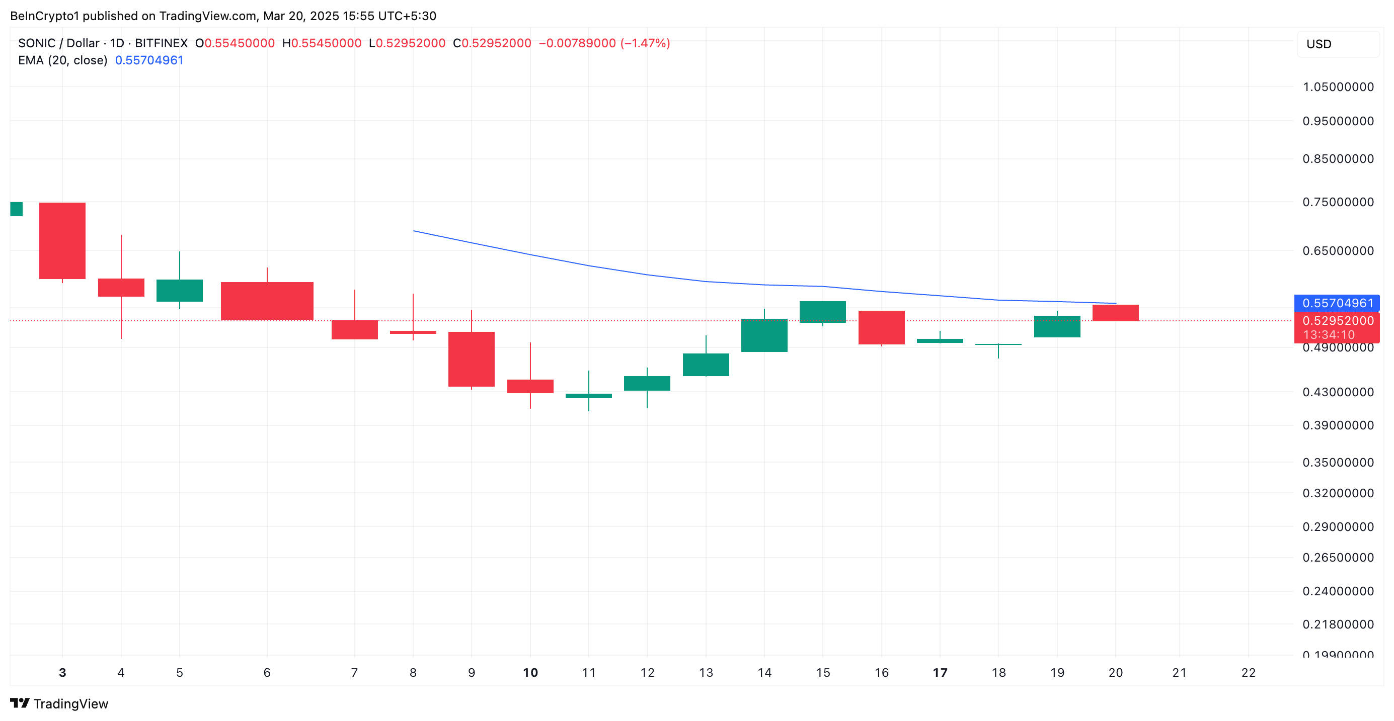 S 的 20 日 EMA 目前在其價格上方形成動態阻力位,位於 0.55 美元。若成功突破這一水平,將進一步強化該代幣的上漲趨勢。