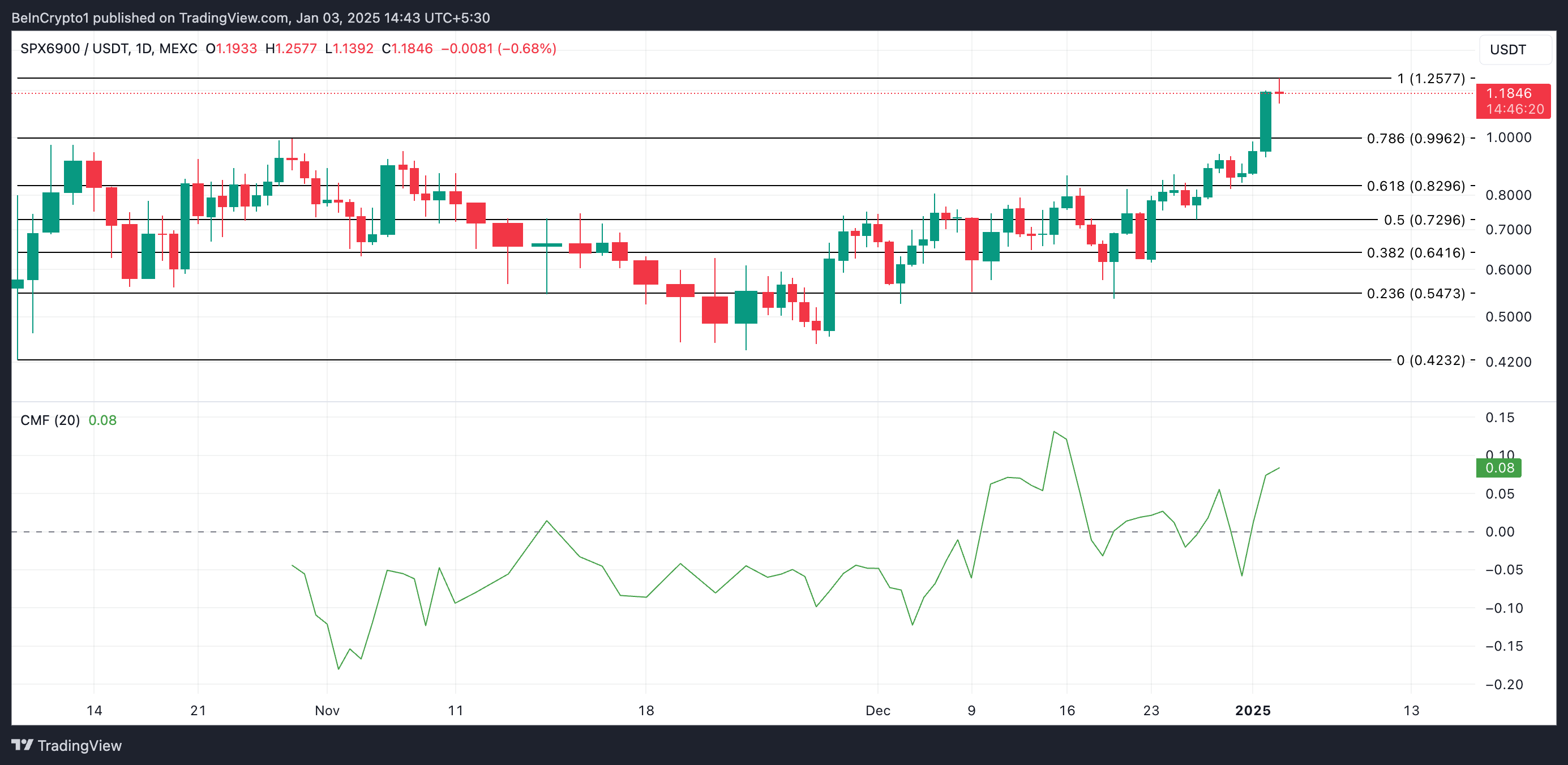 在日線圖上,SPX 的 Chaikin 資金流量(CMF)顯示對該山寨幣的需求增長。截至發稿時,這一指標顯示資金流入資產的趨勢上升,達到 0.08。