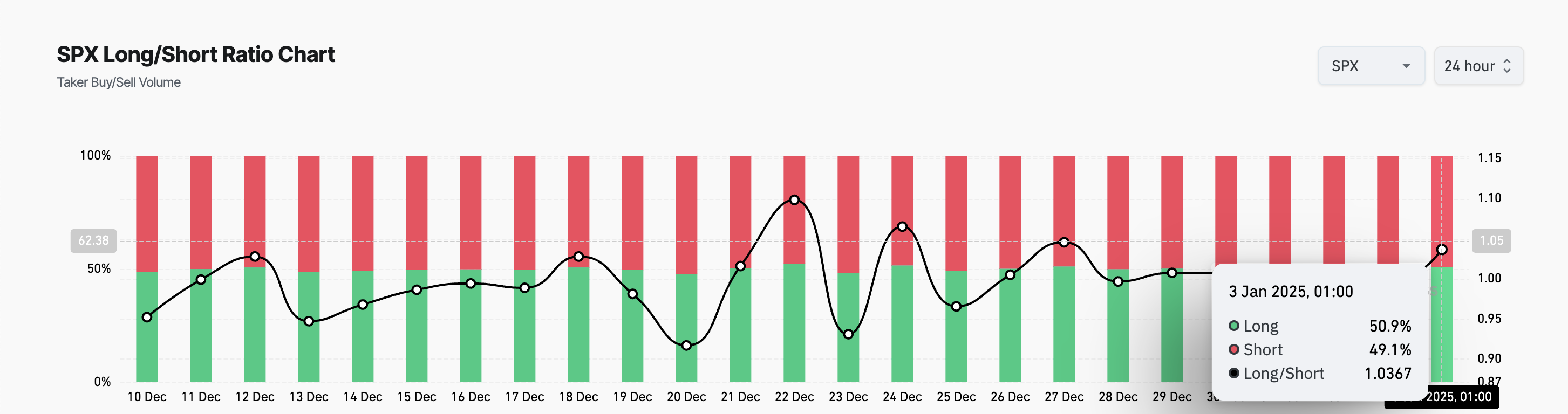 資產的多空比率衡量市場中多頭(買入)和空頭(賣出)頭寸的比例,反映交易者情緒。像 SPX 一樣,當比率高於 1,顯示更多交易者持有多頭頭寸,通常表示看漲情緒。