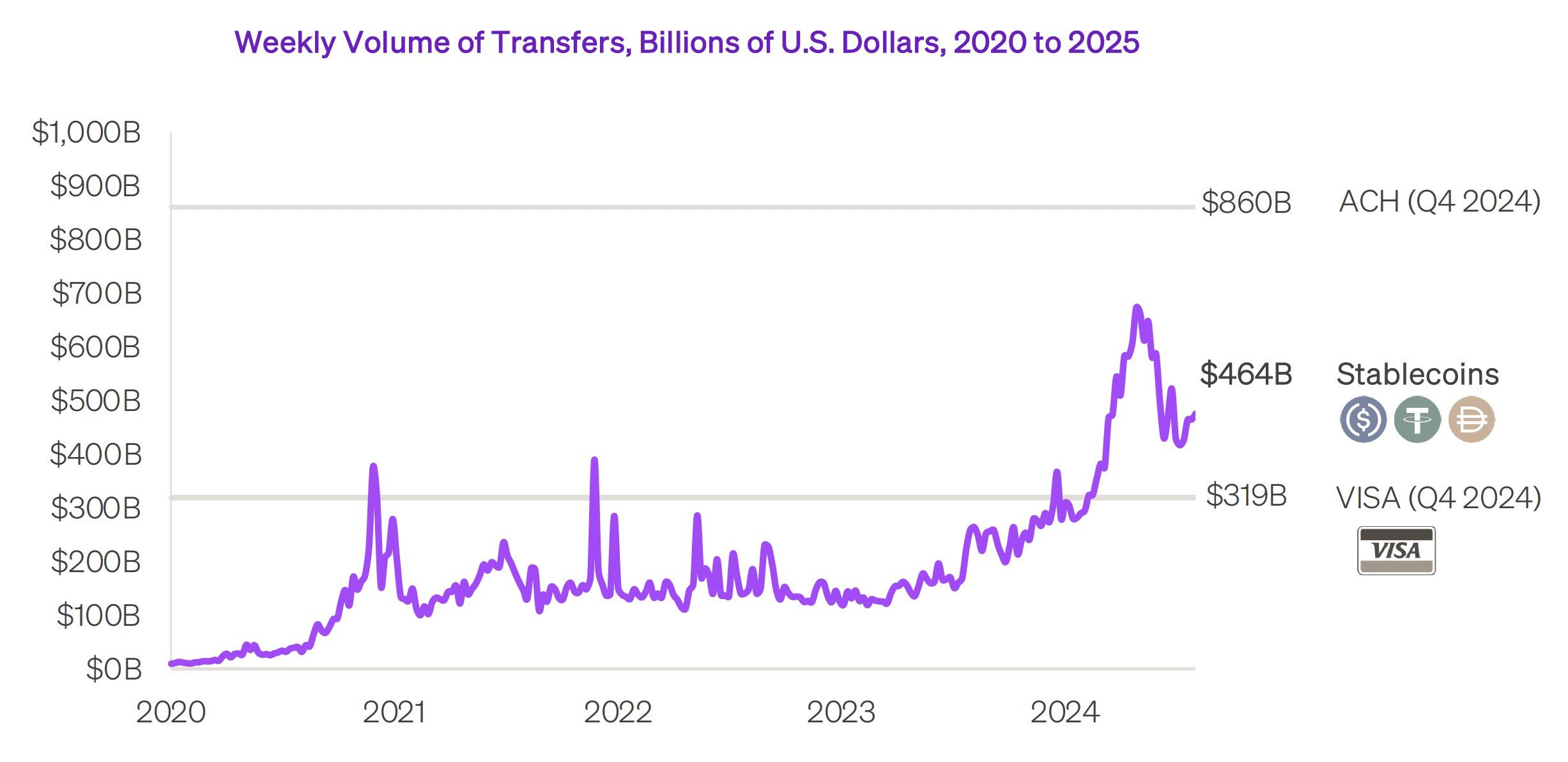 根據數據,2024 年第四季度,穩定幣的平均每週交易量達到 4640 億美元。這遠高於 Visa 的 3190 億美元。Bitwise 的一份報告估計,2024 年穩定幣的總交易量約為 13.5 兆美元。這是穩定幣交易量首次超過 Visa 的年度總量。