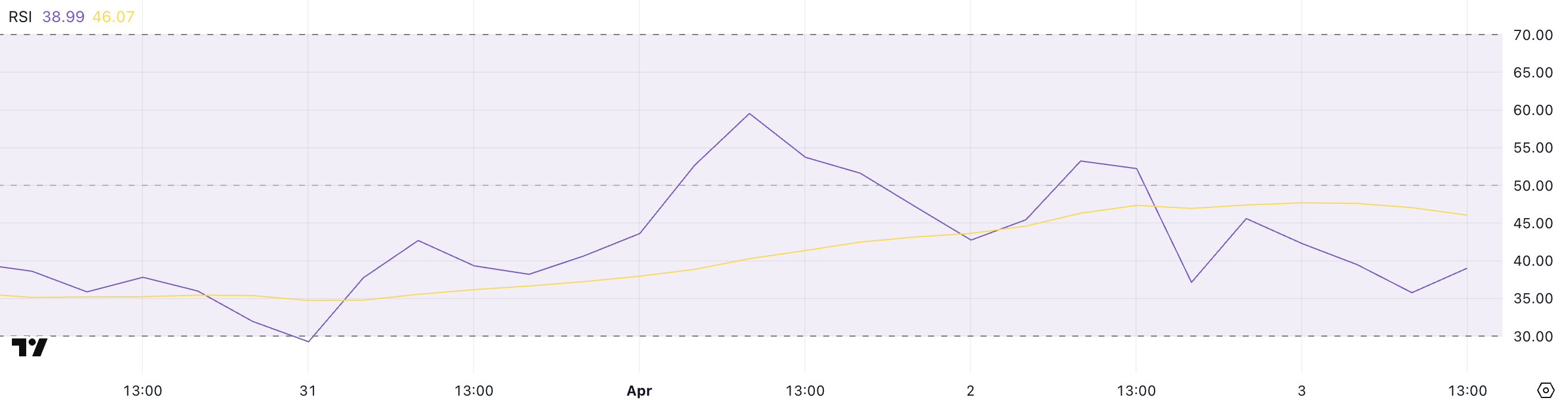 讀數超過 70 表示超買狀態,而低於 30 則表示超賣區域。30 到 50 之間的讀數通常反映看跌動能,但尚未極端到觸發立即反轉。