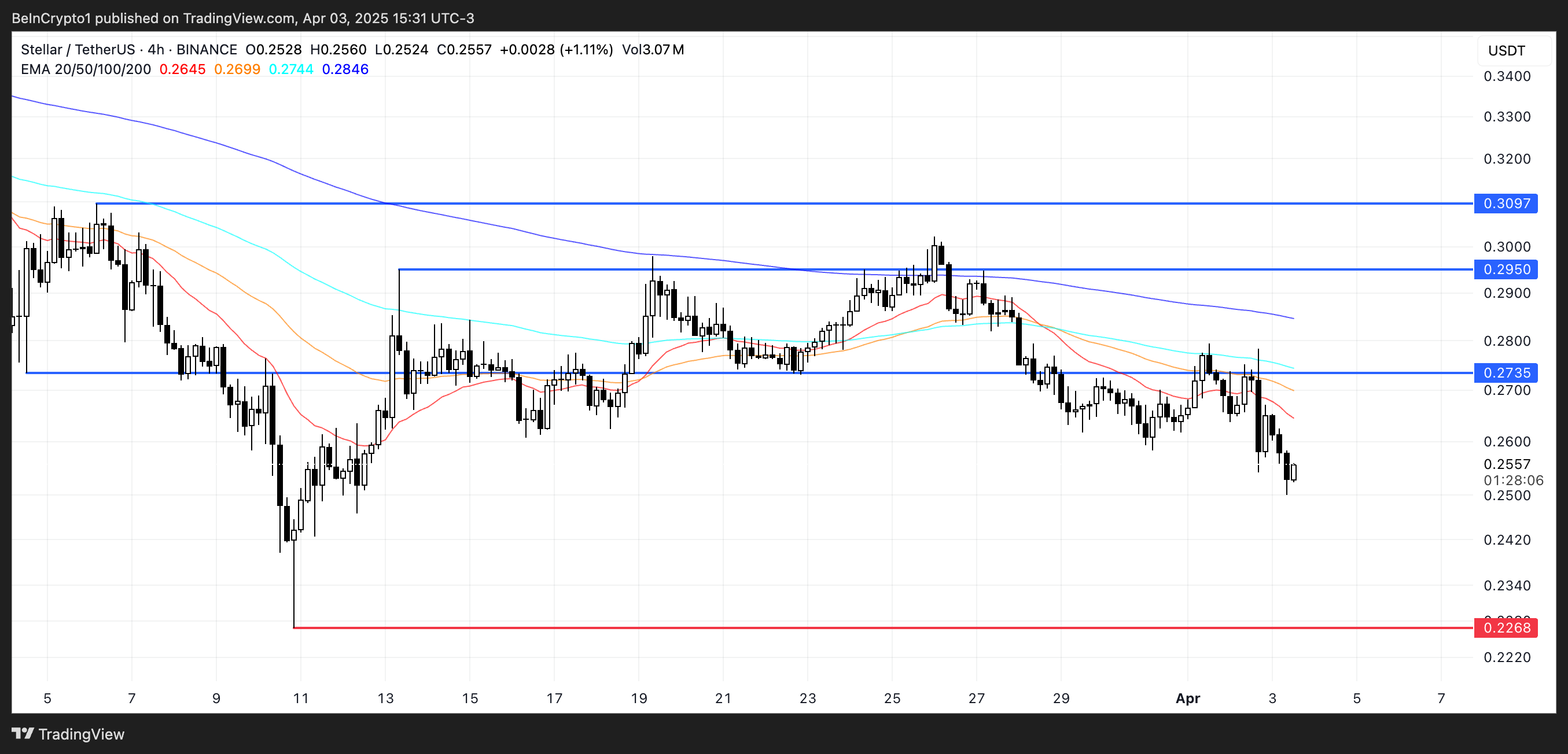 Stellar 價格走勢顯示令人擔憂的信號,EMA 指標指向強烈的看跌趨勢,具有顯著的下行潛力。