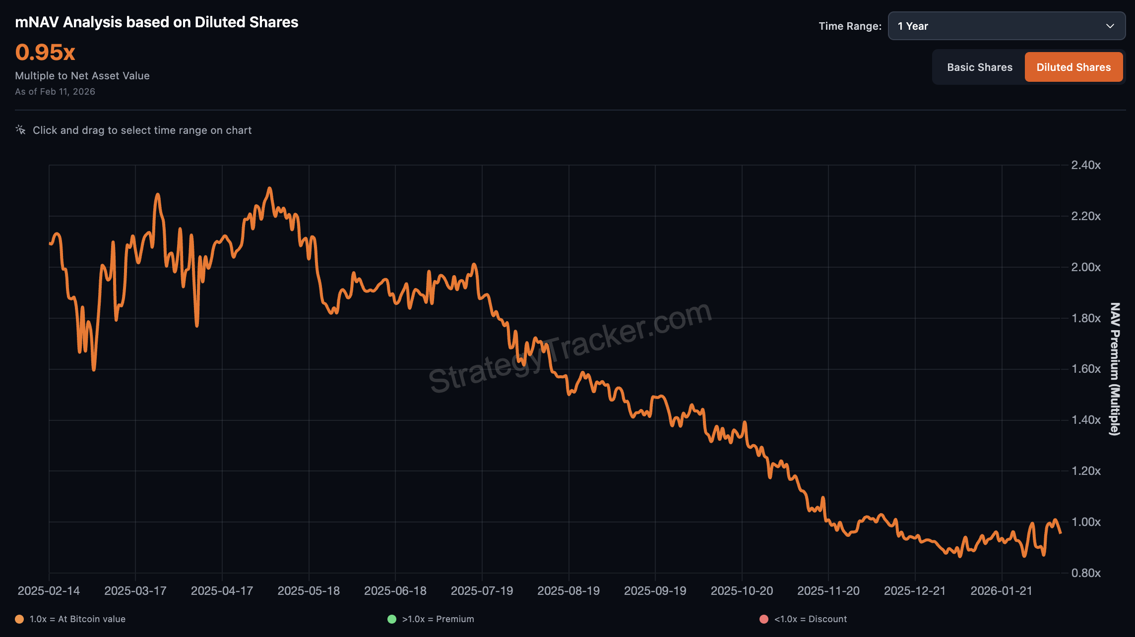 根据 SaylorTracker 数据,MicroStrategy 稀释后 mNAV 约为 0.95 倍,这意味着其股价已低于每股所对应的比特币资产净值。