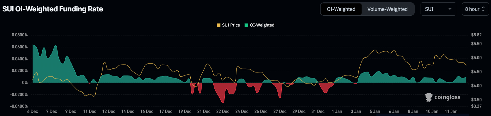 SUI 的資金費率在過去十天內保持正值,儘管最近價格下跌,這仍顯示出交易者的樂觀情緒。這種持續的正面情緒表明市場參與者正在押注價格復甦和潛在的新歷史高點。SUI 社群內的情緒仍然看漲,這可能提供反彈所需的動力。