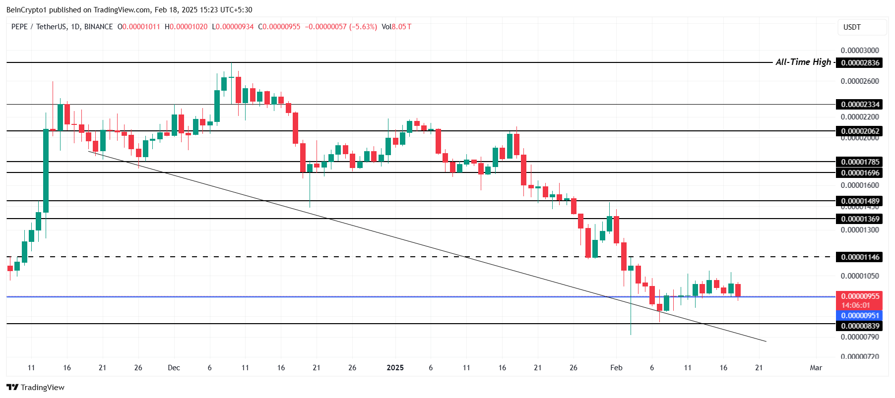 然而,如果 PEPE 失去 0.00000951 美元的支撐,價格可能會下跌至 0.00000839 美元。跌破此水平將使看漲前景失效,並增加持續虧損的風險。投資者應監控關鍵支撐位,以評估潛在的價格走勢。