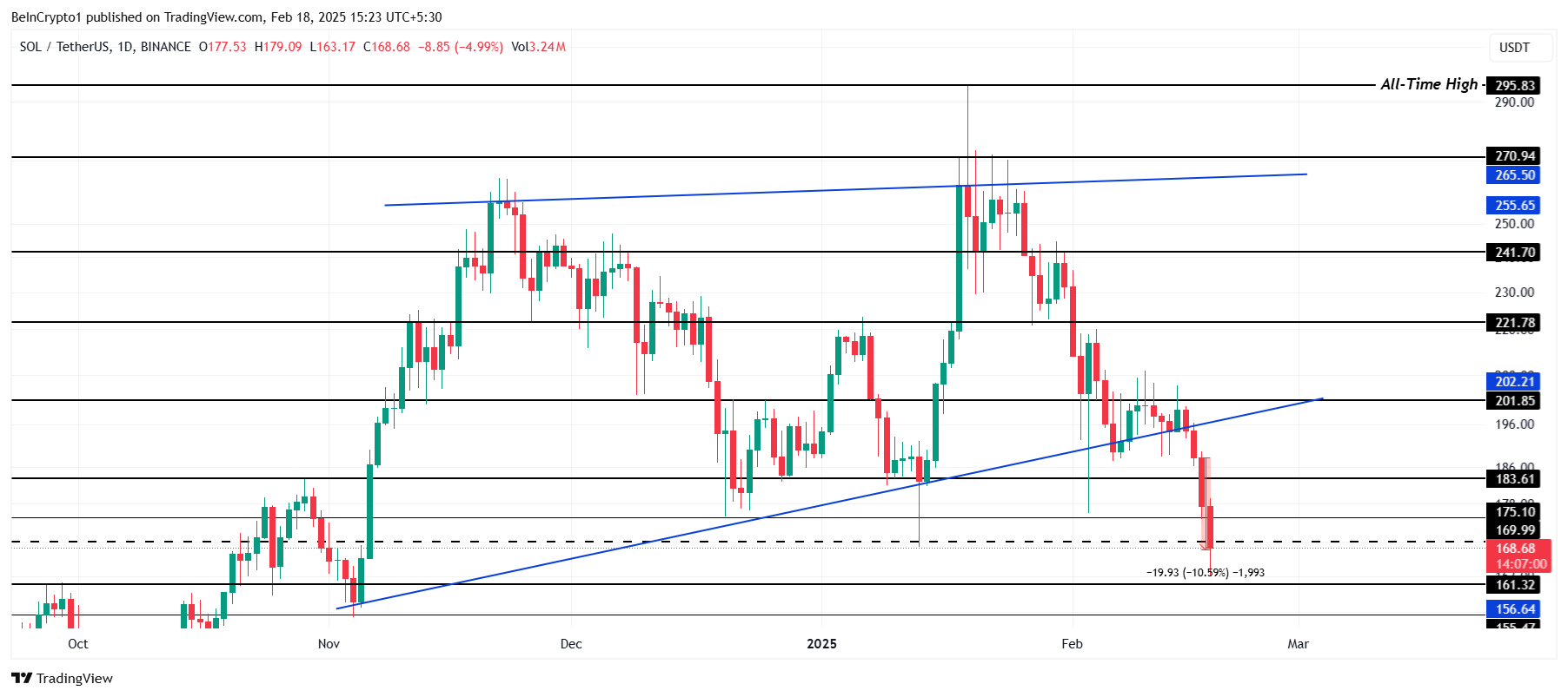 由於這種負面關注,Solana 的價格下跌,過去 24 小時內下跌了 10.5%。這一價格走勢使上升楔形形態失效,SOL 目前交易價格為 168 美元。該山寨幣未能保持上升動能,表明短期內可能持續承受看跌壓力。