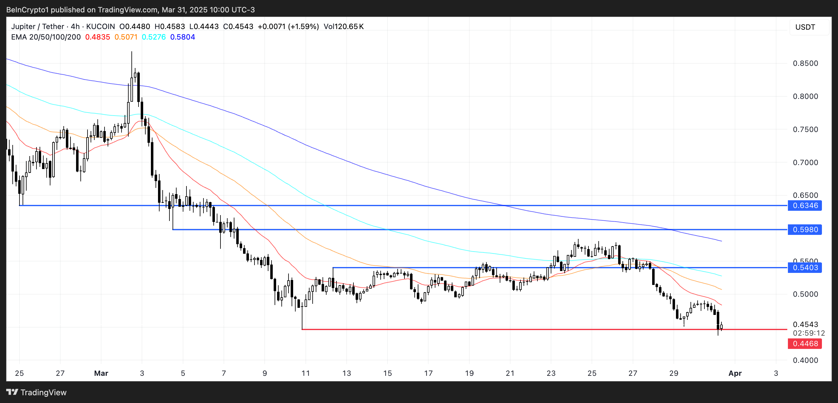 然而,如果市場情緒轉變且動能回升,JUP 可能再次上升——首先測試 0.54 美元的阻力位,然後在看漲壓力加大時,可能進一步上升至 0.598 美元甚至 0.63 美元。