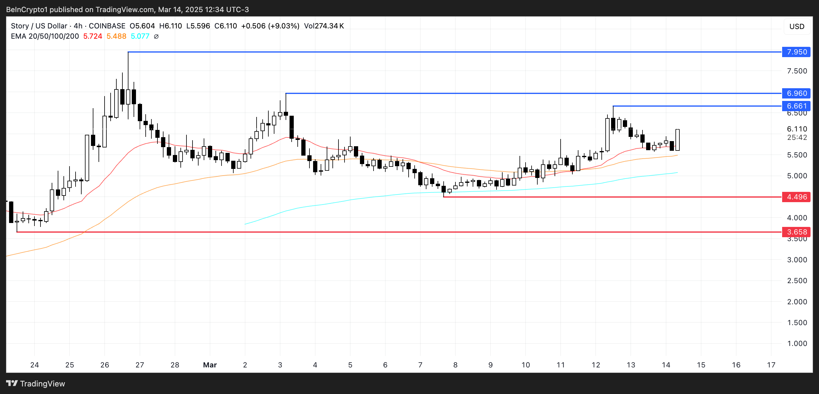 如果 AI 幣像幾個月前一樣重拾動能,Story 可能會推向 6.66 美元和 6.96 美元的關鍵阻力位。突破這些水平可能使其升至 7.95 美元,甚至首次突破 8 美元,創下歷史新高。AI 領域的強勁看漲情緒可能會進一步推動上漲。