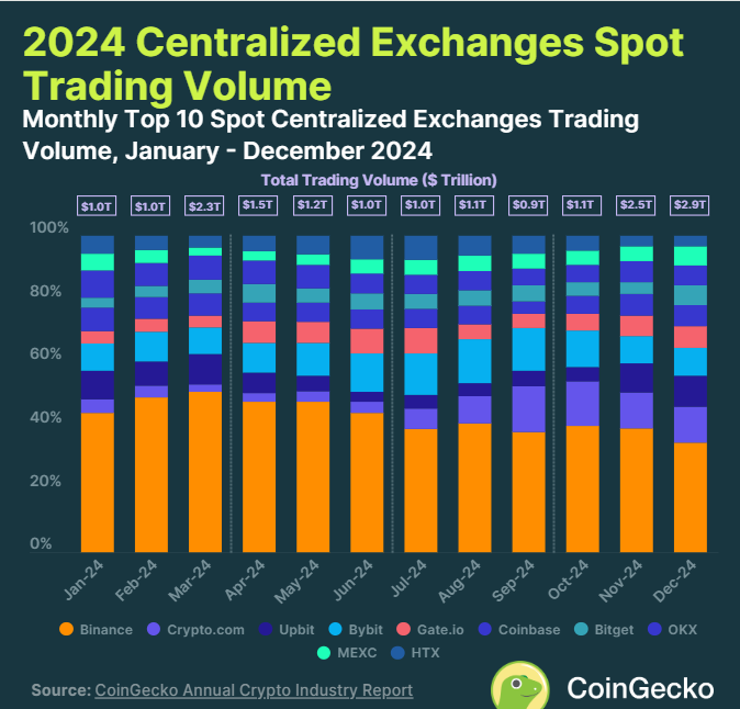 在最近的報告中,CoinGecko 指出,前 10 大集中式交易所(CEXs)的交易量在第 4 季度相比第 3 季度飆升了 111.7%。