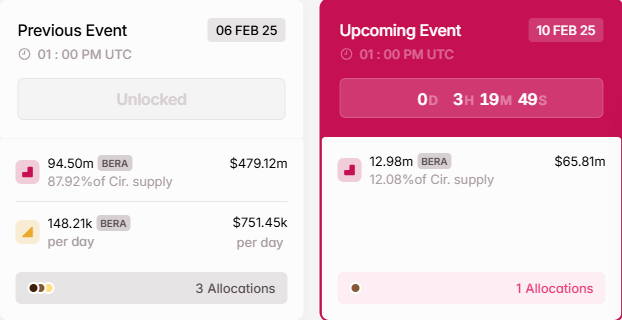此外,交易者和投資者應準備好應對週一 Berachain 代幣解鎖帶來的波動。BeInCrypto 報導稱,Berachain 將於週一下午 1:00 UTC 解鎖其 12.08% 的 BERA 代幣供應量。