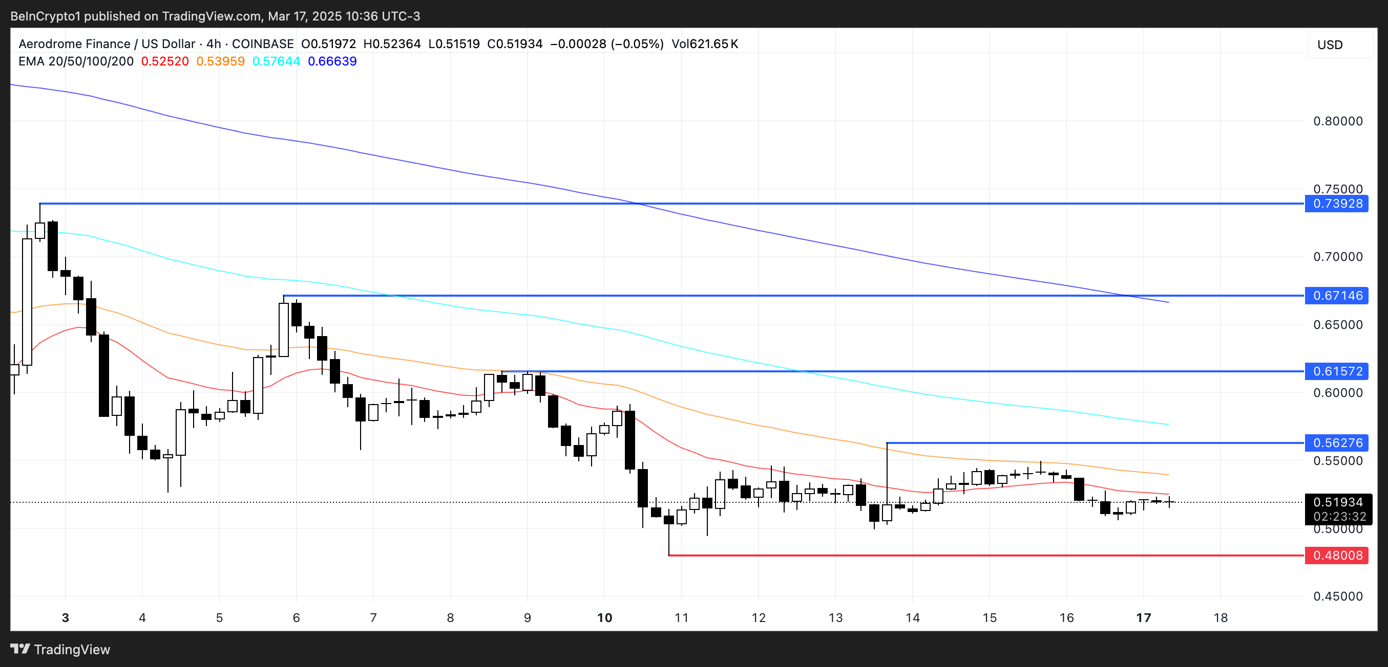 如果下跌趨勢持續,AERO 可能很快會重新測試 0.48 美元的支撐位。