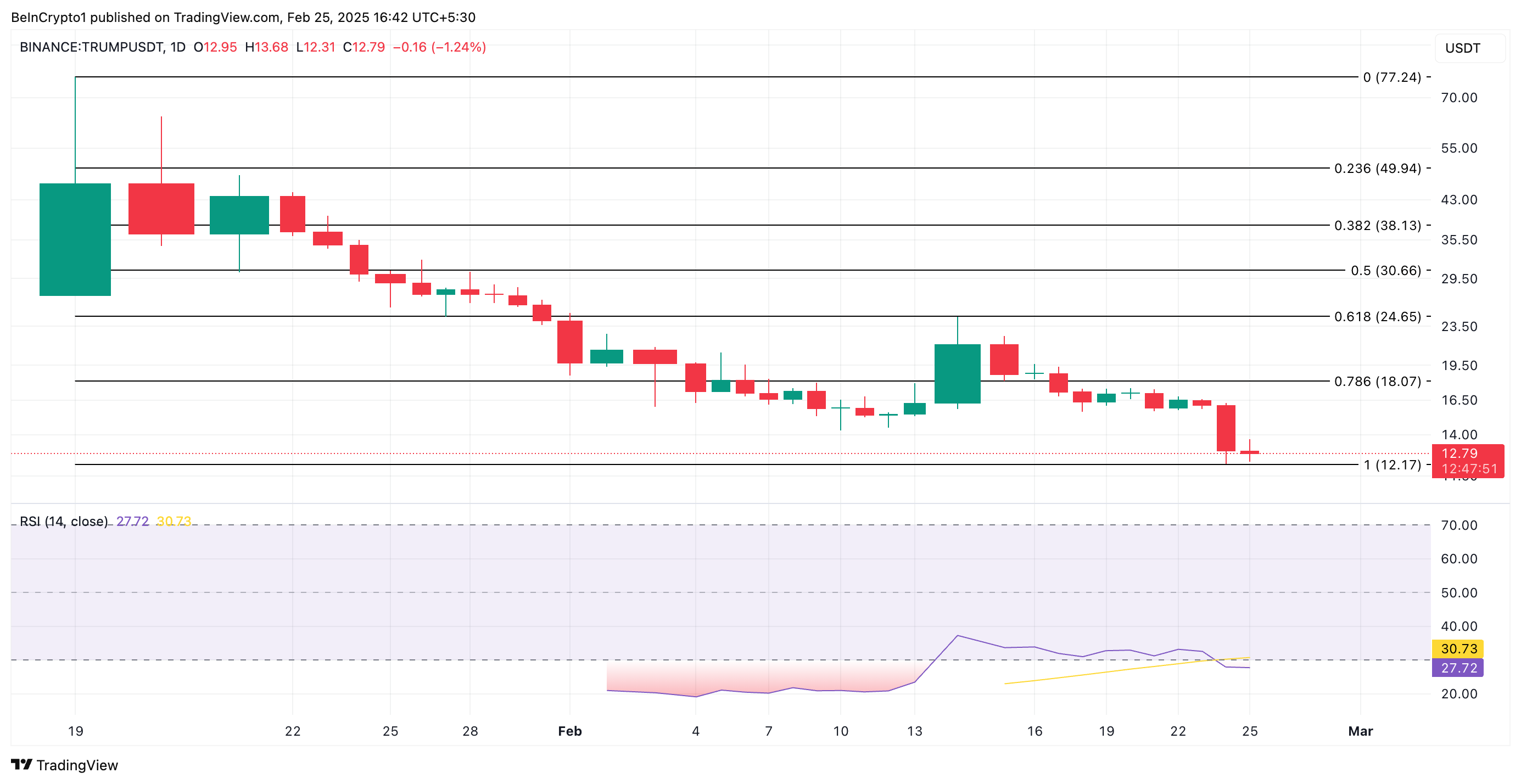 基於 Solana 的迷因幣 TRUMP 是今天搜索最多的山寨幣之一。其交易價格為 12.78 美元,過去 24 小時內下跌 14%。在過去一個月中,TRUMP 的價值已經損失 55%,其相對強弱指數 (RSI) 的讀數顯示可能準備反彈。