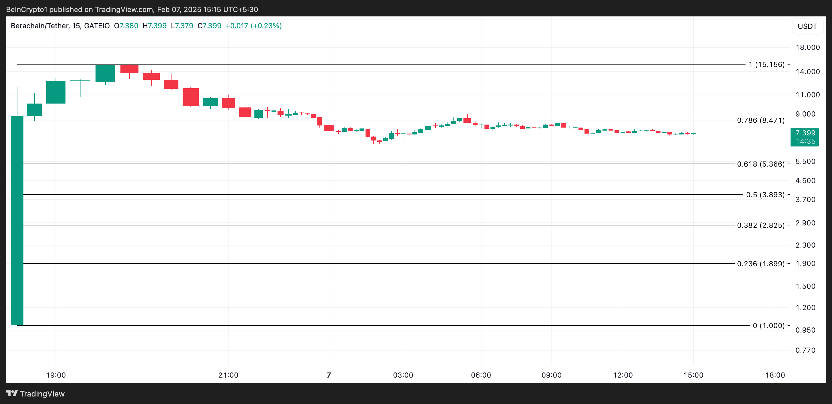 然而,空投後立即出現拋售潮,導致該幣價值下跌。BERA 在發稿時交易價格為 7.39 美元,過去24小時內價格下跌了 17%。