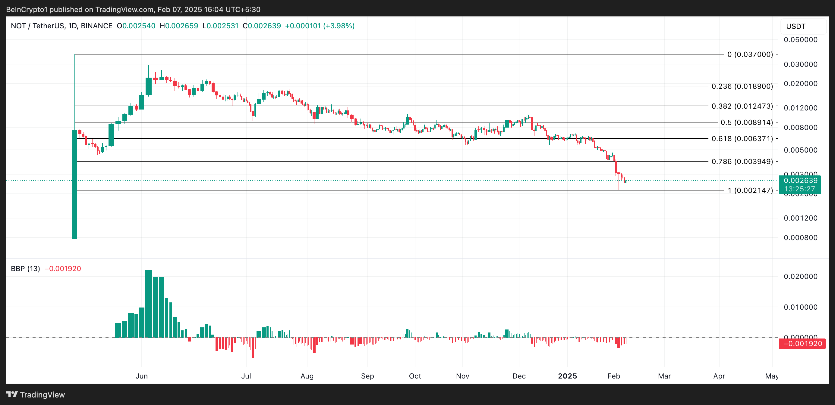 截至發稿時,NOT 交易價格為 0.0026 美元。過去一週其價值下跌了 40%。事實上,週一該山寨幣跌至 0.0021 美元的九個月低點,隨後略有反彈。