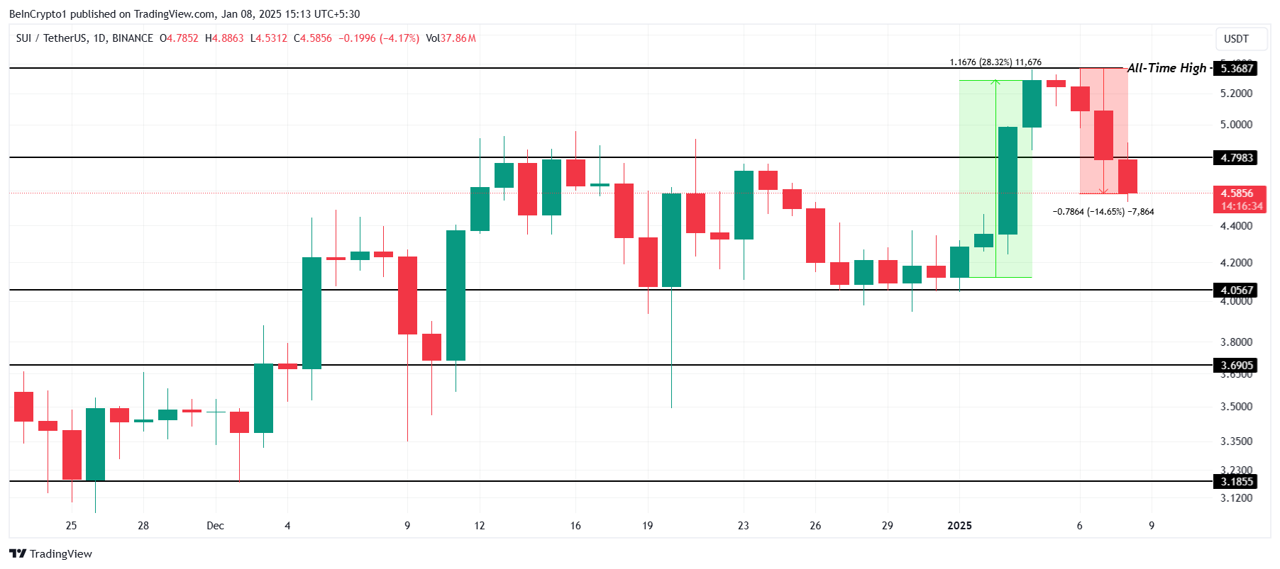 SUI 的價格與 VIRTUAL 的走勢相似,在創下 5.36 美元的歷史新高後 72 小時內下跌 14.6%。這次突然下跌突顯了市場中不斷增加的賣壓。